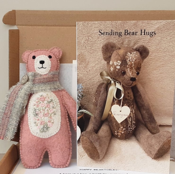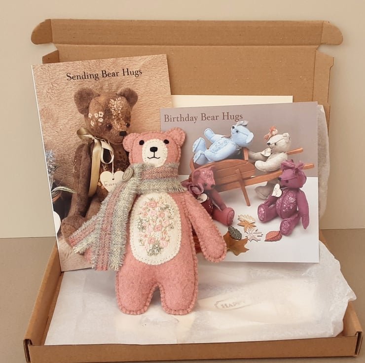 Teddy bear letterbox gift set. Hand sewn and embroidered unique Sending bear hugs gift that will fit through a letterbox.