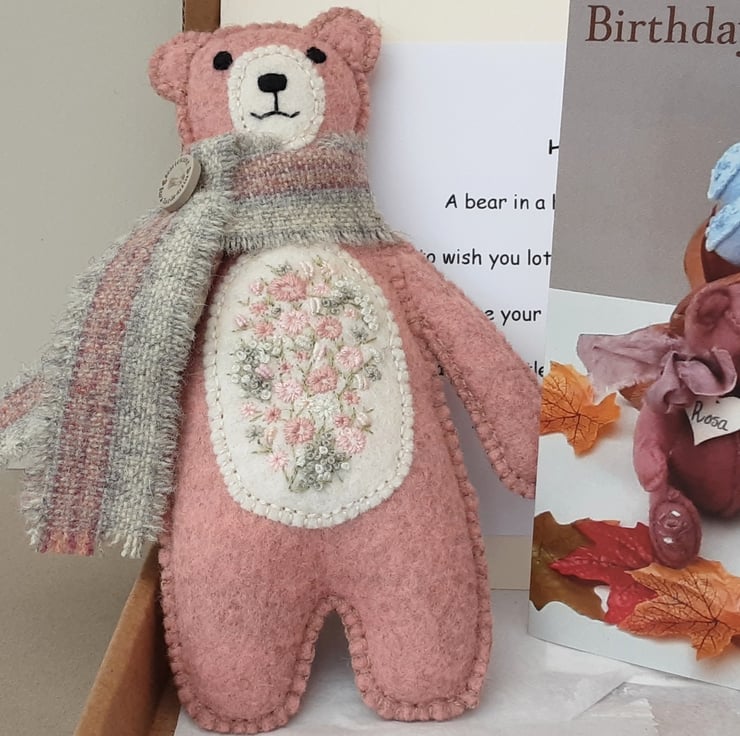 A unique design, 6.5" wool felt scandi style teddy bear, decorated with floral hand embroidery in pinks and greys onto muddy pink with snow white contrast wool felt. Finished with a pink stripe wool scarf and filled with polyester filling.