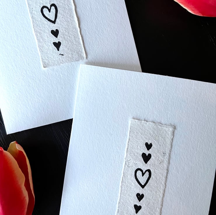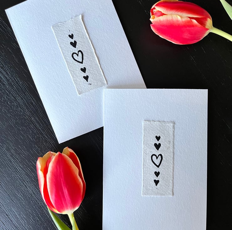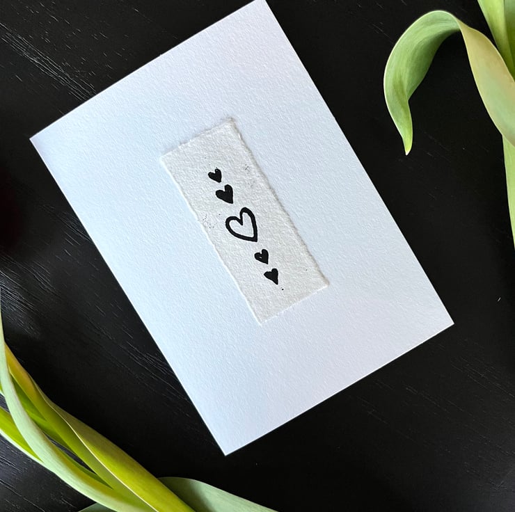 This is a beautiful greeting card ready for you to give to that special someone. featuring 5 hearts. It has been made using an original design that has been hand-carved into linoleum and then handprinted using caligo safe wash relief ink onto Khadi paper (weighted: 150gsm) and mounted onto heavy duty mixed-media paper.