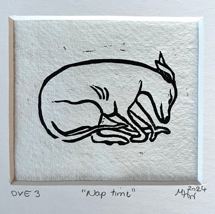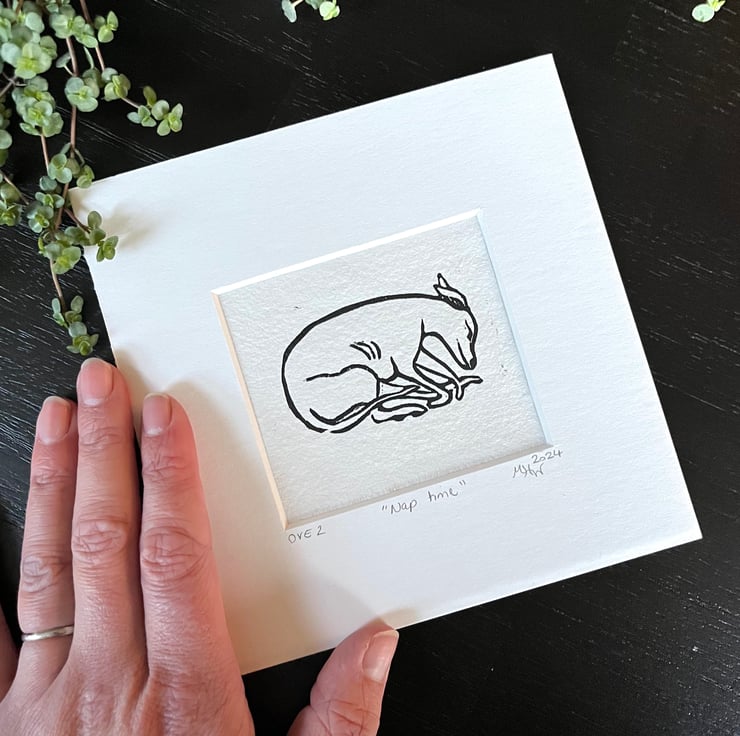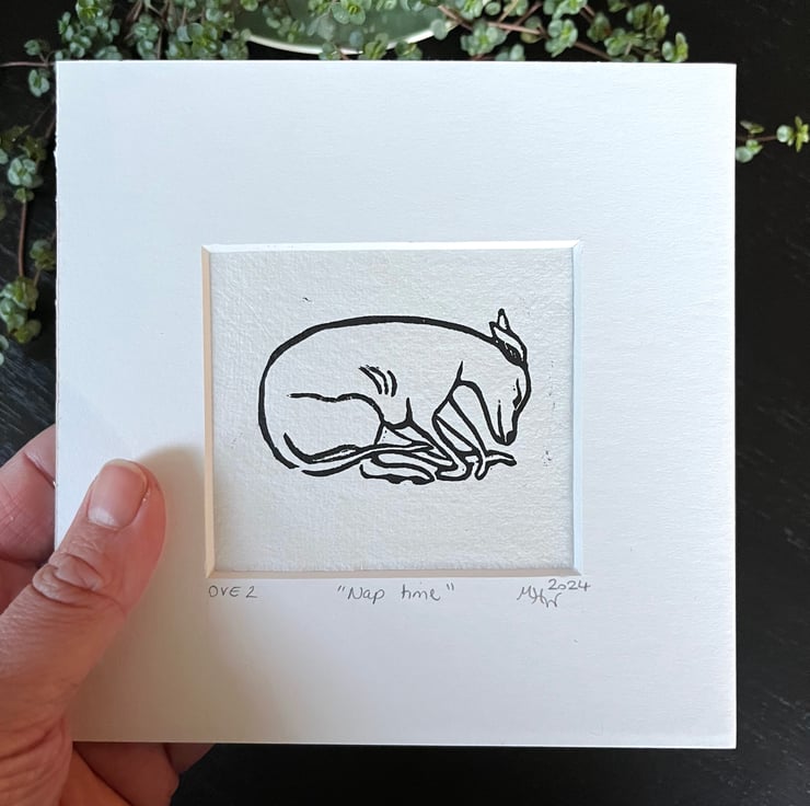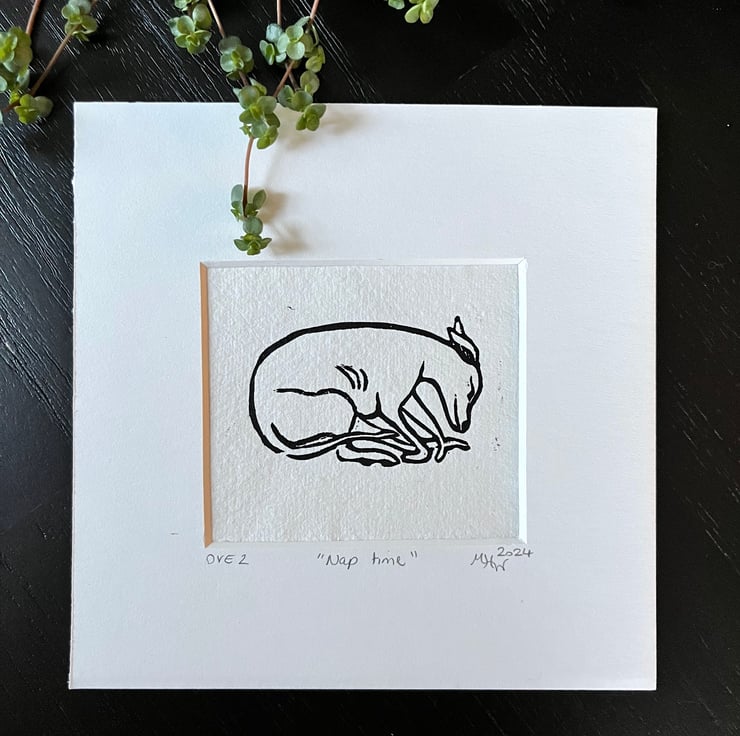 A lovely mini lino print of a sleeping whippet, inspired by my own boy, Franco.