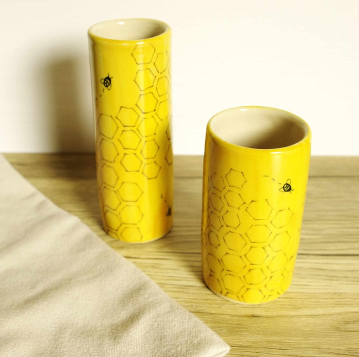 These vases are hand-thrown on a wheel using earthstone clay and glazes fired in an electric kiln.