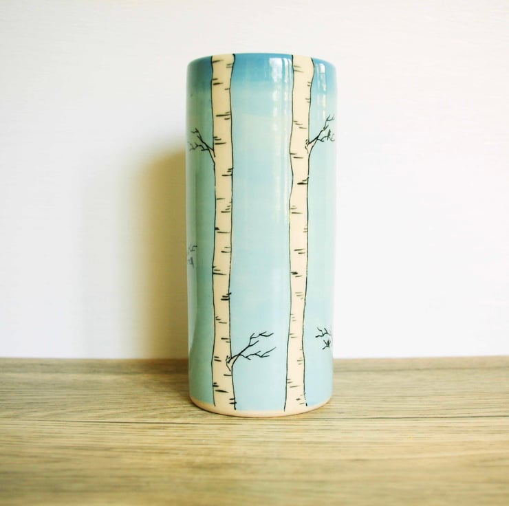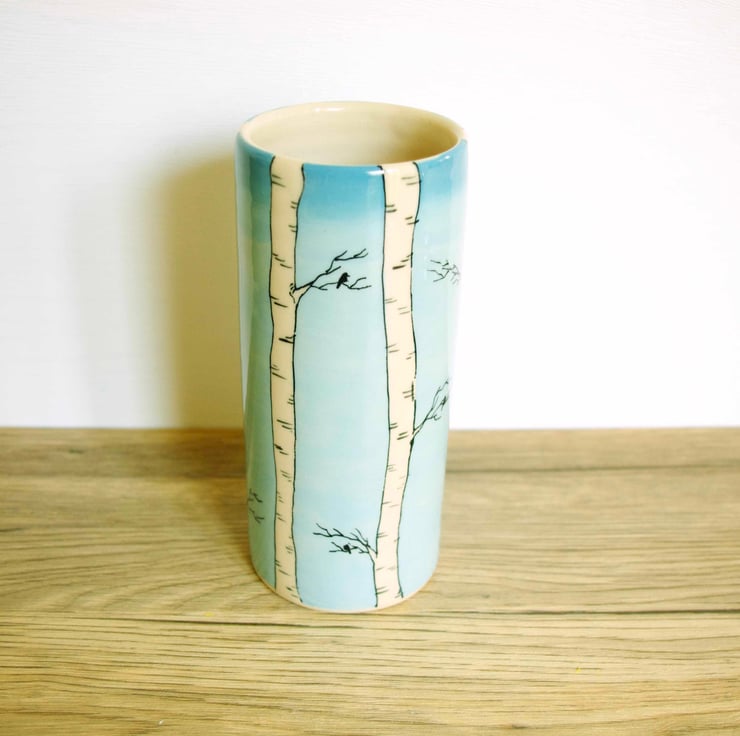 Tall Cylinder Vase - Birch Tree, Sky and Birds