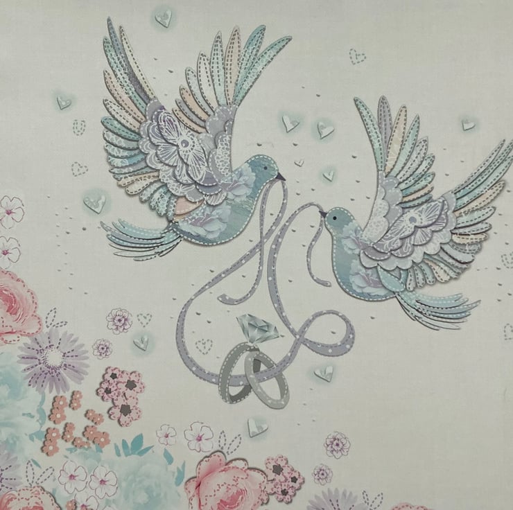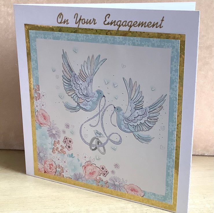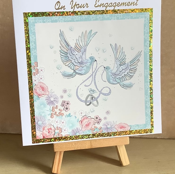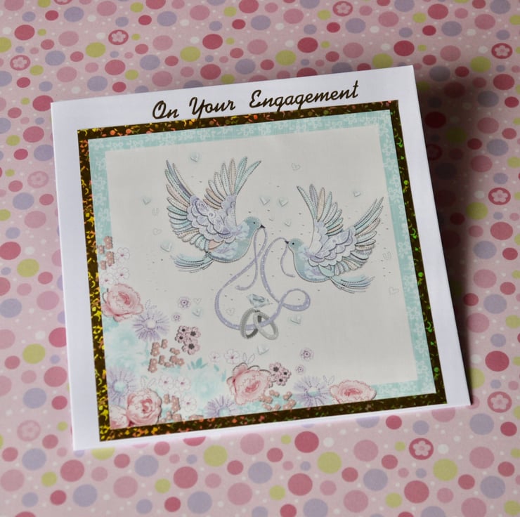 This white printed card features a pair of doves holding rings on a ribbon. They are surrounded by hearts and flowers. The image has a metallic gold holographic border and a matching gold "On Your Engagement" greeting has been added.