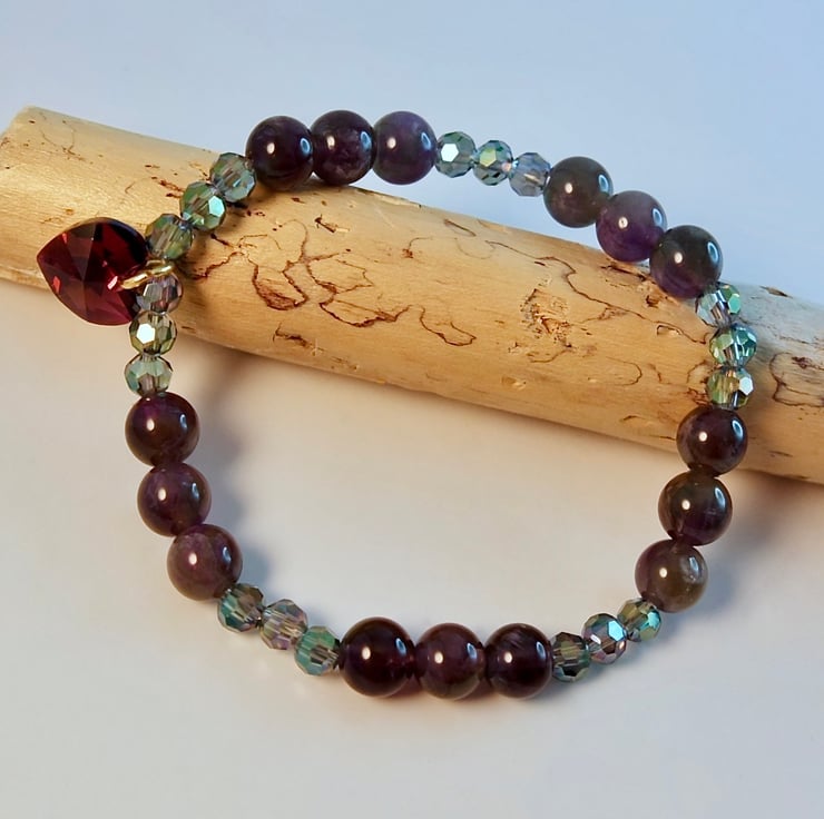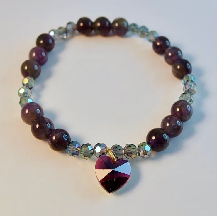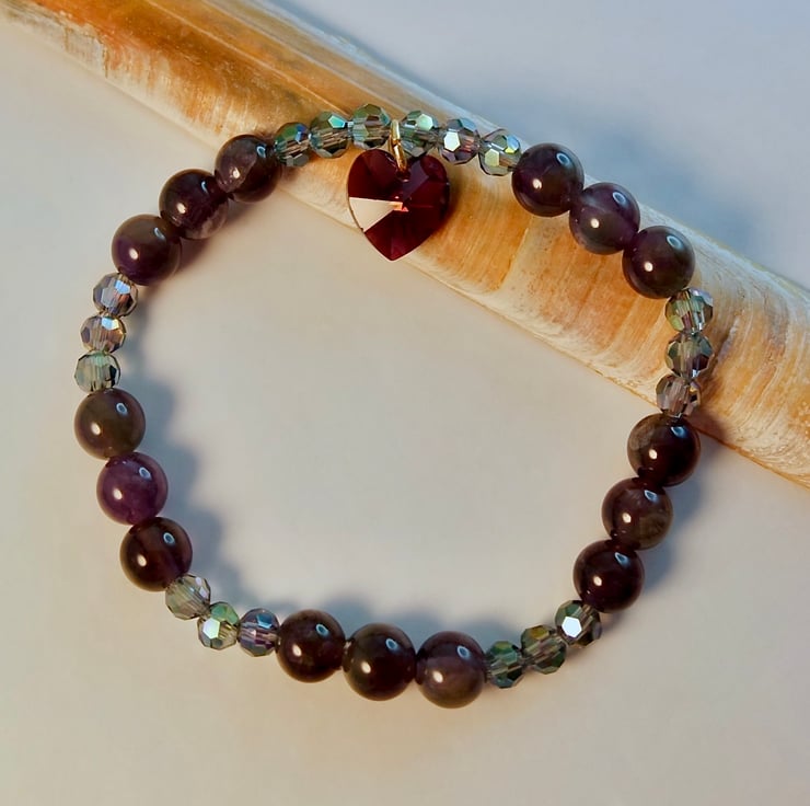 Sage Amethyst & Faceted Glass Bracelet With Swarovski Heart - Handmade In Devon