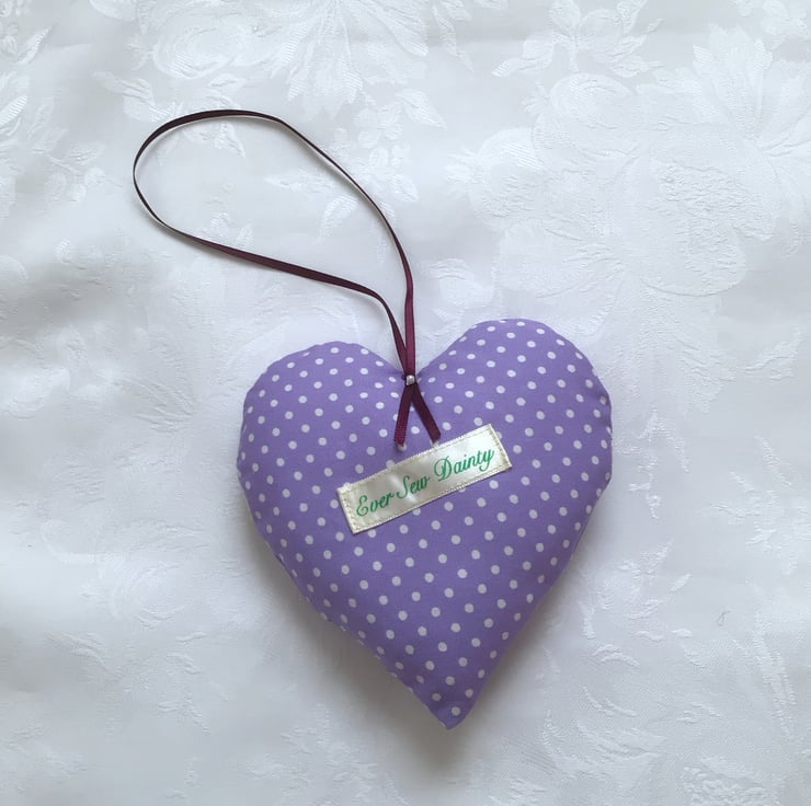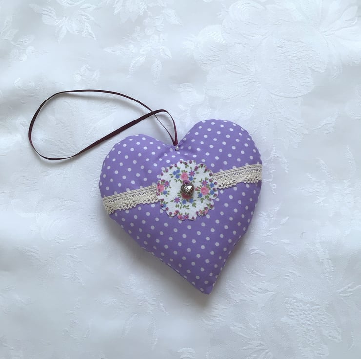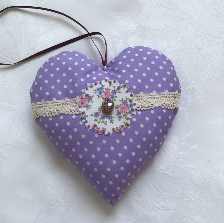 Hanging heart fabric decoration. Made from a purple and white polka dot cotton fabric. Has a cream cotton lace, fabric flower and silver colour charm embellishment to the front. Filled with polyester toy filling and hanging on purple ribbon.