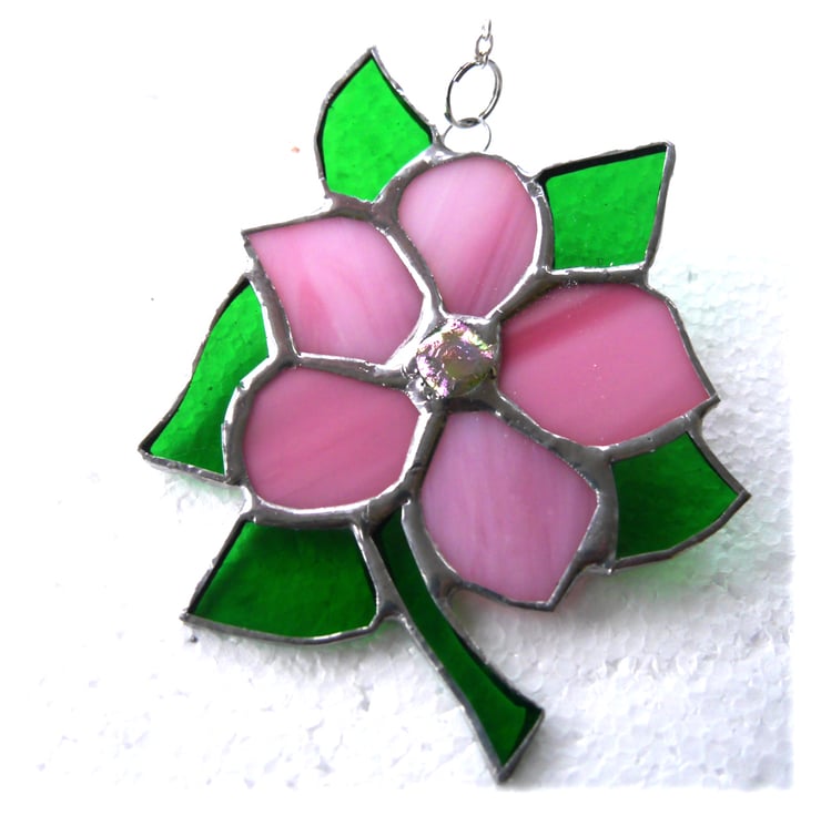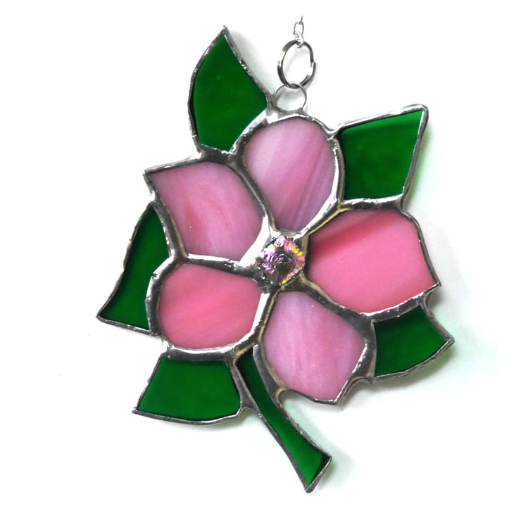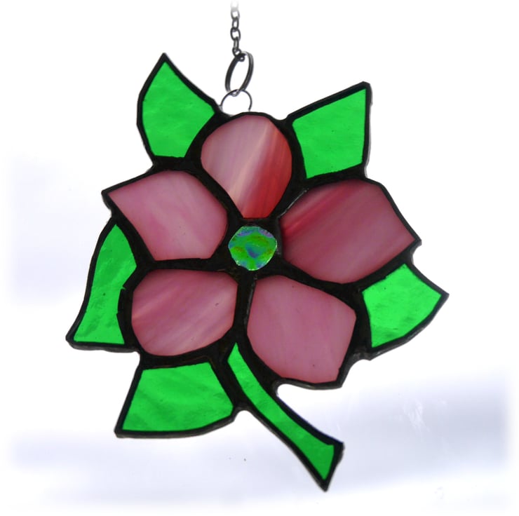 It is a gorgeous pink clematis flower made with lovely pink glass, quite opaque as most of the lovelier colours of pink glass ae and with bright green for the leaves and a pretty little dichroic glass nugget I fused in my kiln in the centre.