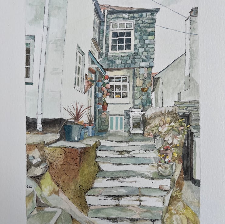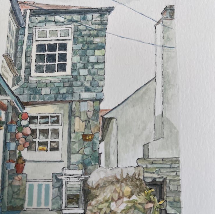 An original gouache and ink painting of a building from a seaside location. Gouache paints and black ink were used on 300gsm cold pressed acid free watercolour paper. The paper measures 18cm by 26cm and the image measures approximately 12.5cm by 18.5cm. An original painting that would make a special gift for someone. The painting will be sent inside a board back envelope.