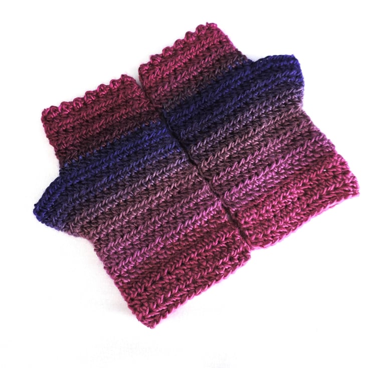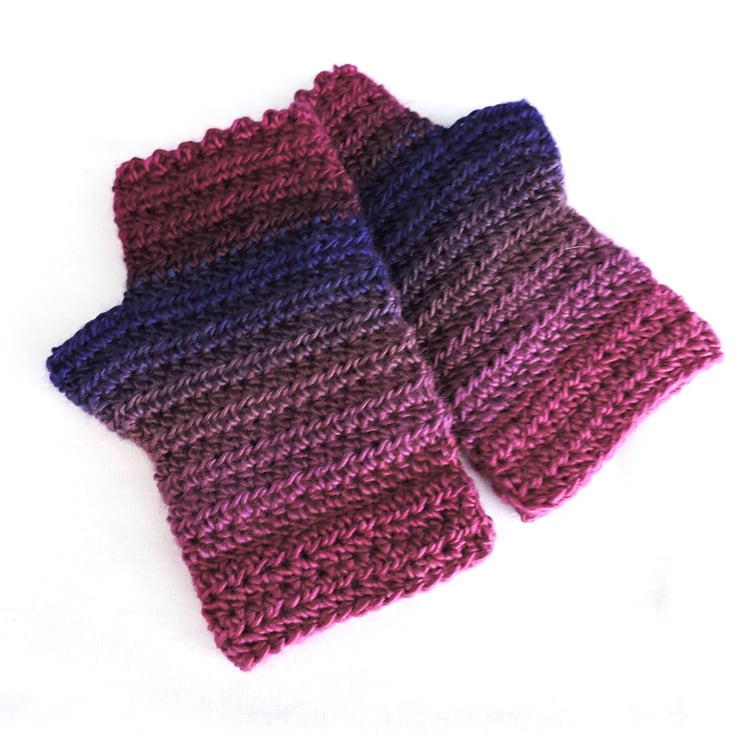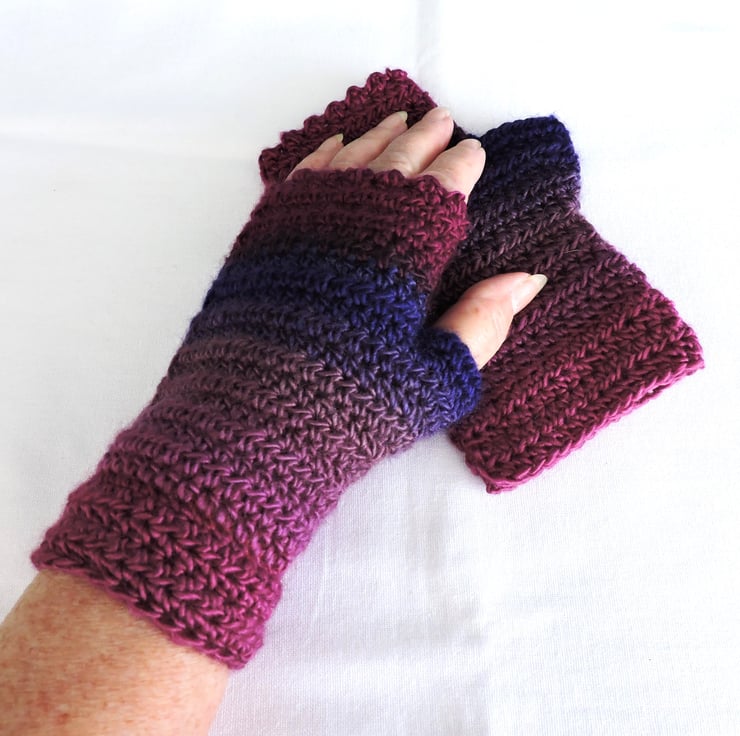 Fingerless mitts crocheted in a beautifully soft premium self striping acrylic yarn. Vibrant graduated colours of purple, grape and pink. Plain body mitts with a picot edge to the top. An ideal winter warmer for those who like to keep their fingers free.