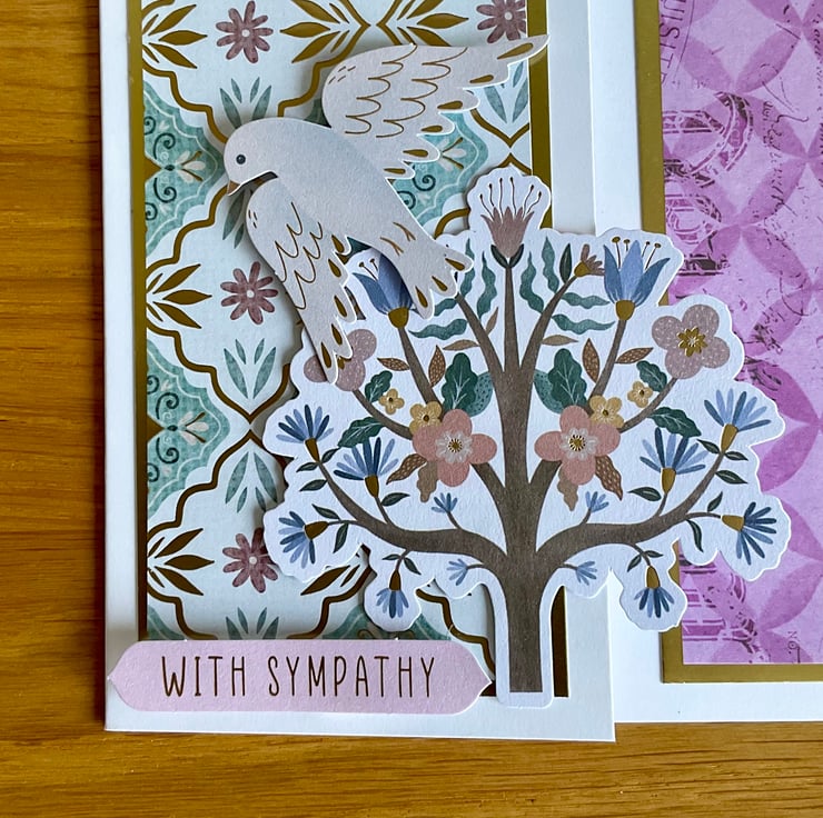 The front of the card has been shaped to reveal the inside pattern which has been layered with gold card and a soft purple paper. The words ‘Sweet memories’ and ‘With sympathy’ have been added.