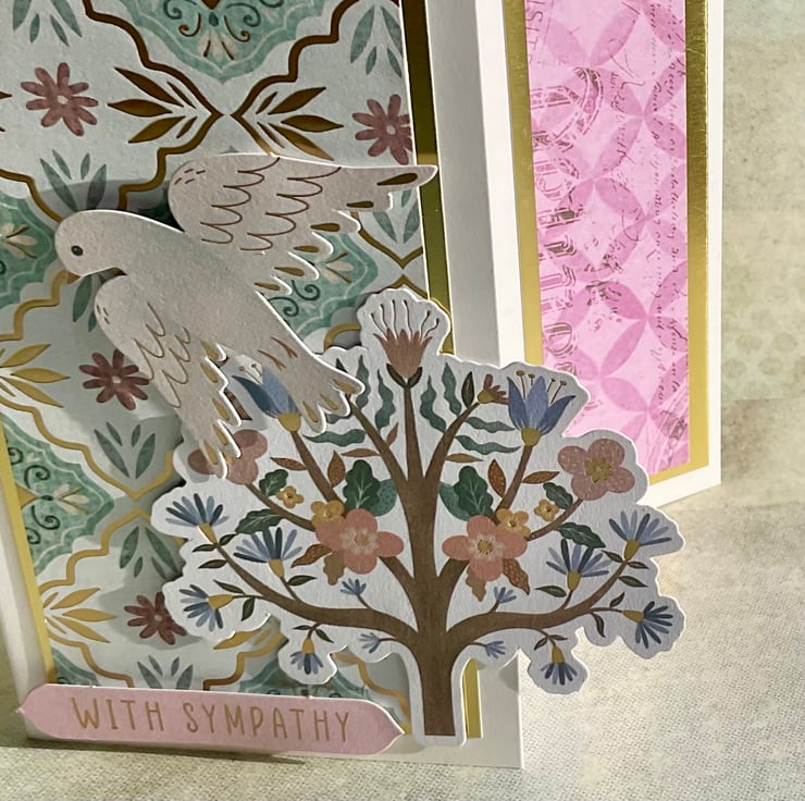 The hammered white base card has been layered with a gold background overlaid with a geometric print paper in teal and gold. A die cut tree and bird in flight have been added in 3D.