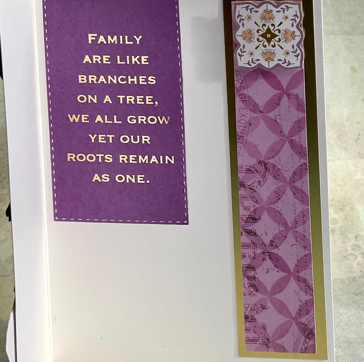 The wording ‘Family are like branches on a tree, we all grow but our roots remain as one’ in gold on a purple background have been added on the inside.