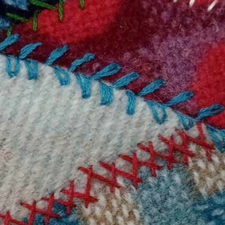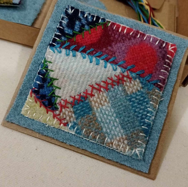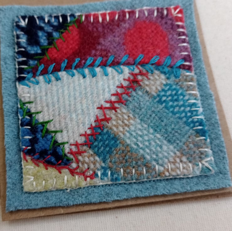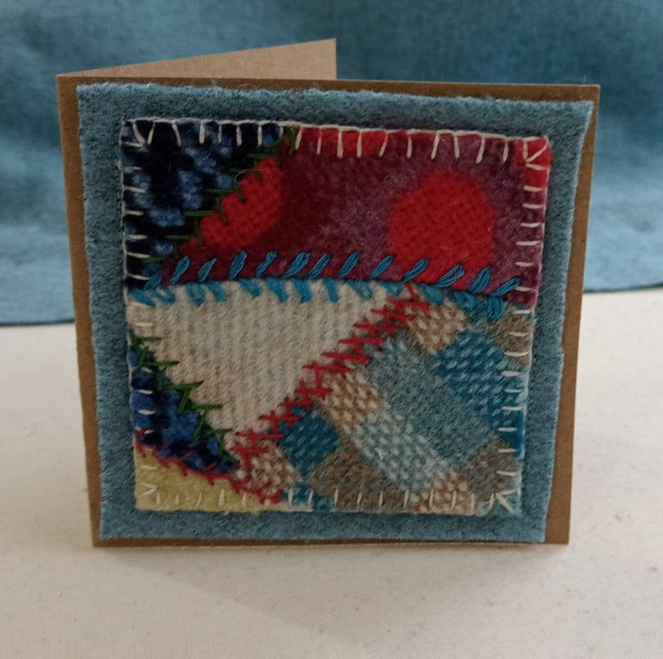 A lovely little fabric picture featuring a crazy patchwork of scraps of Welsh wool blankets beautifully embellished with different decorative embroidery stitches. Securely attached to a folded card and supplied with a matching envelope for easy gifting, this picture can be displayed as it is, or popped into a little frame. A lovely little card for your Dad, or a teenager.