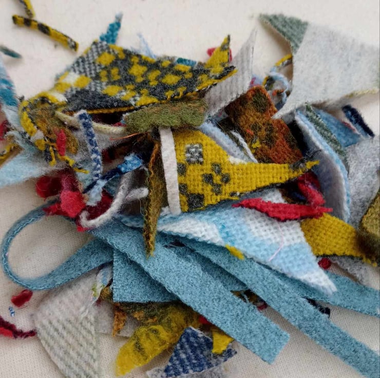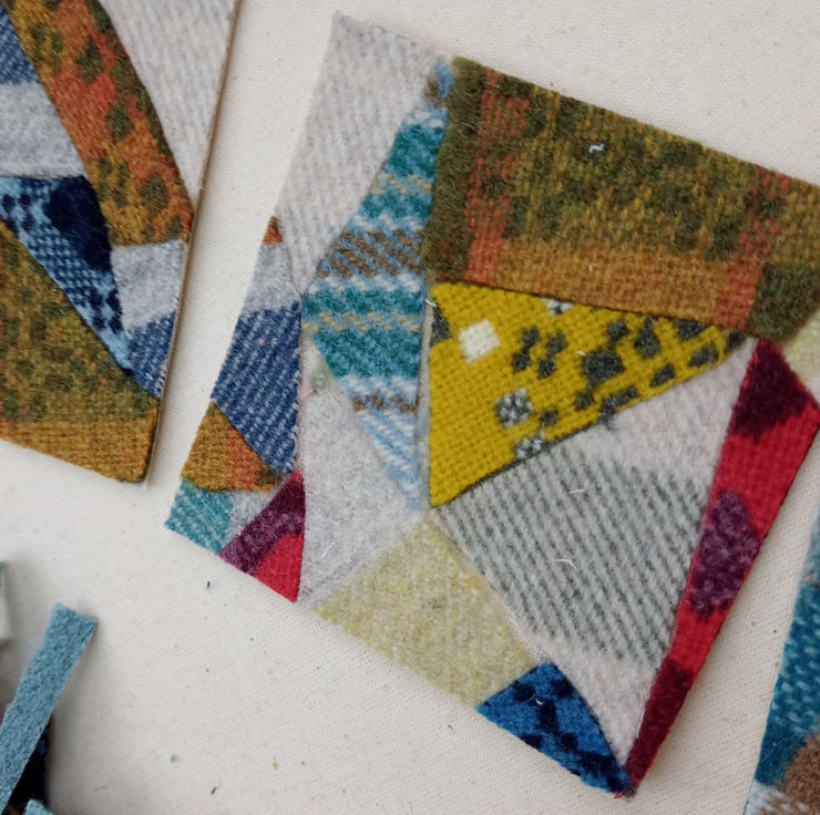 To make these pictures I carefully patch together offcuts left over from making my wool hearts, using a foundation patchwork technique onto cotton canvas. I then hand cut each picture to size and hand sew it to a soft blue wool fabric, with different embroidery stitches linking the individual patches. Finally, I machine sew it to a little eco-friendly card.