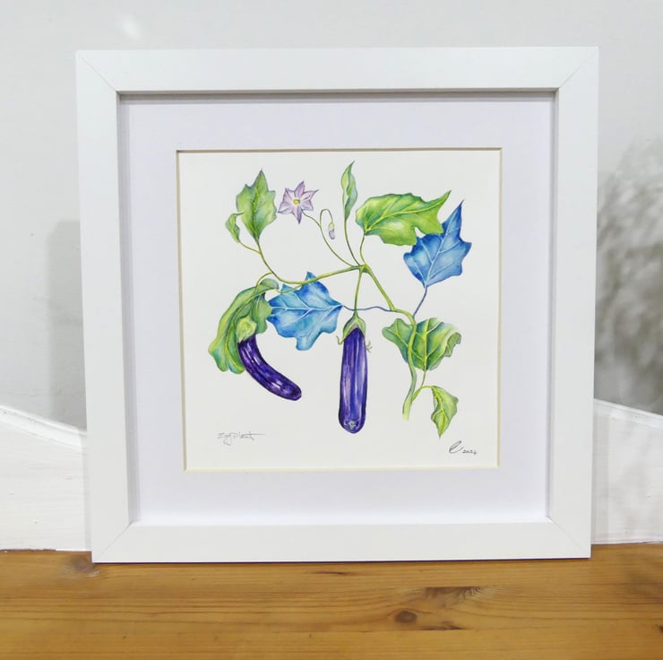 A framed modern botanical watercolour painting of long eggplants. This is the perfect addition to a kitchen or dining space and a gorgeous gift for any occasion.