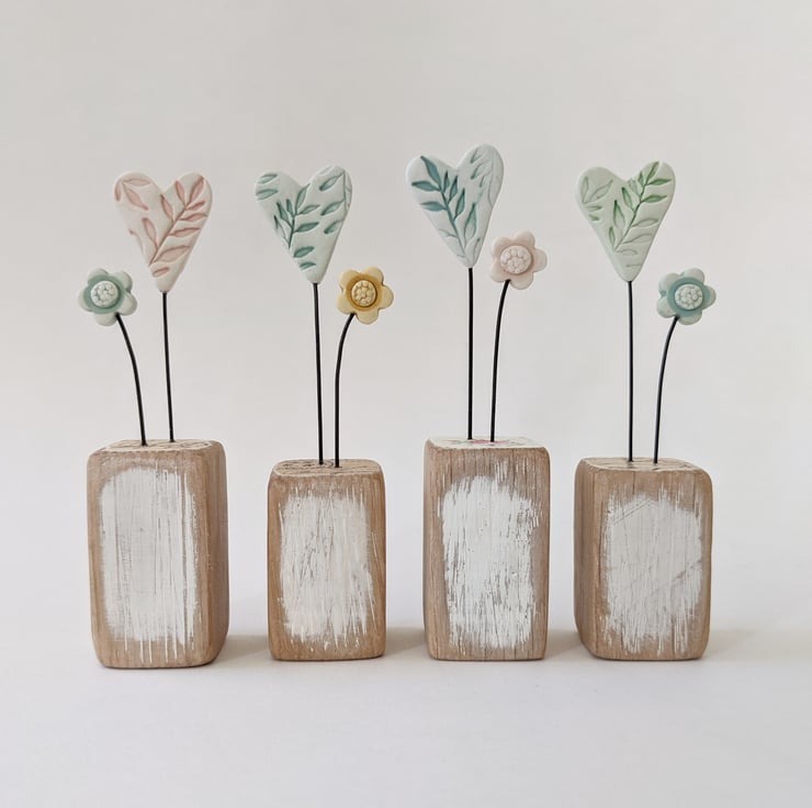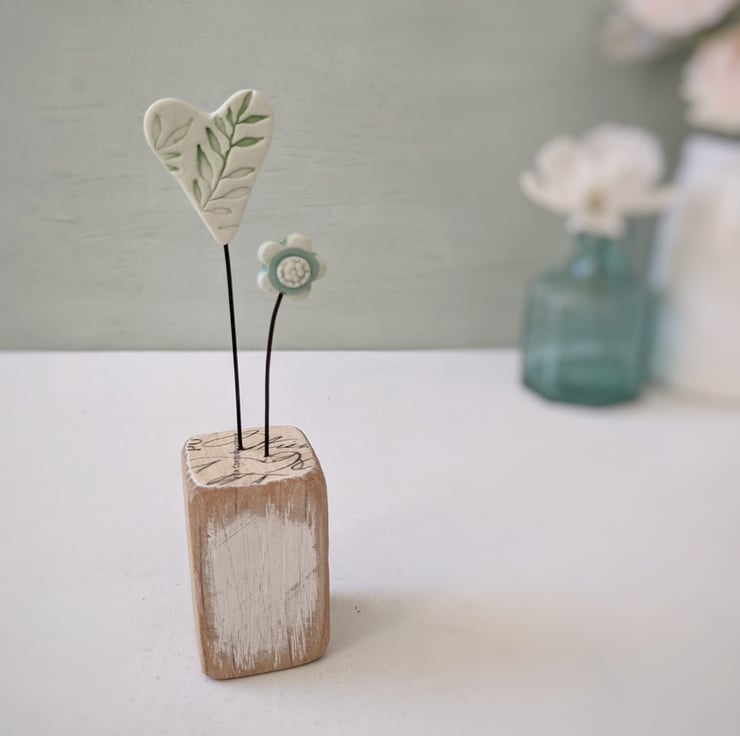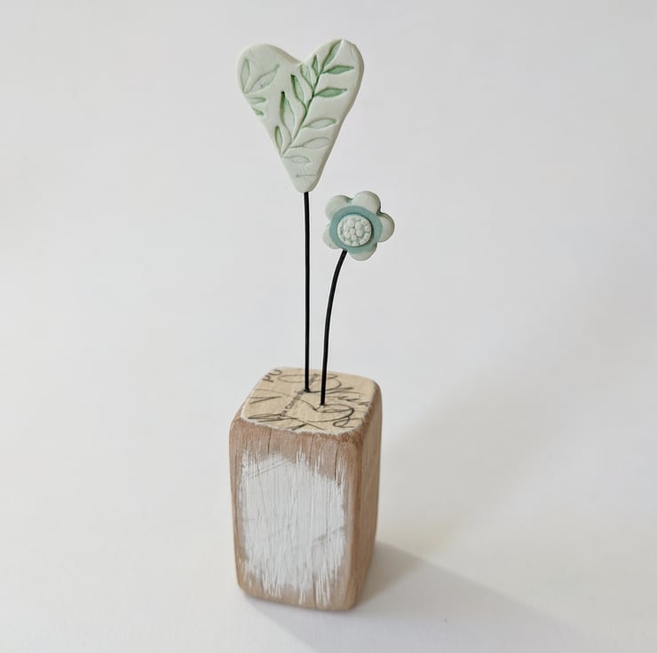A little patterned heart and teeny flower stand on a wire stalks in a sanded and stamped oak wood block.