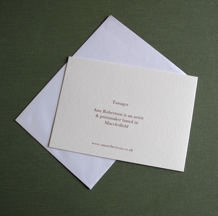Blank greeting card. Original art work by Ann Robertson. Printed on high quality Tintoretto Gesso paper with a hammered finish. A6 width 14.8 cm height 10.5 cm. Side fold. Plain white envelope.