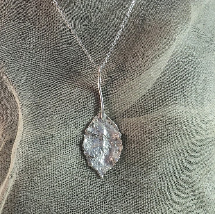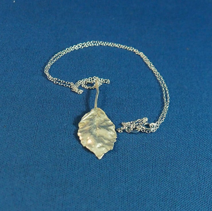 Pretty little pendant made by applying silver clay to a real beech leaf, the leaf burns away when the silver is fired, leaving a clear, perfect impression of itself. That sounds easier than it is but it's a simple description of the technique.