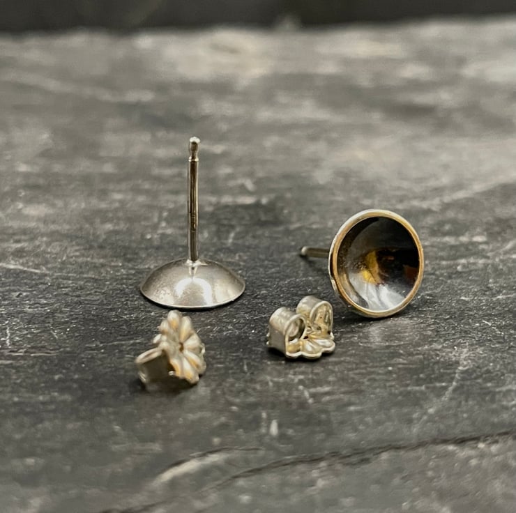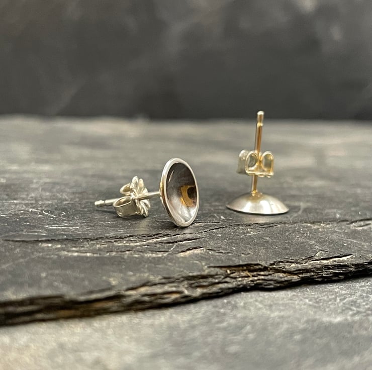 Sterling silver disks, domed and oxidized to create simple studs. These simple silver earrings shimmer and create the illusion of a set stone.
