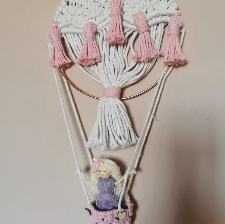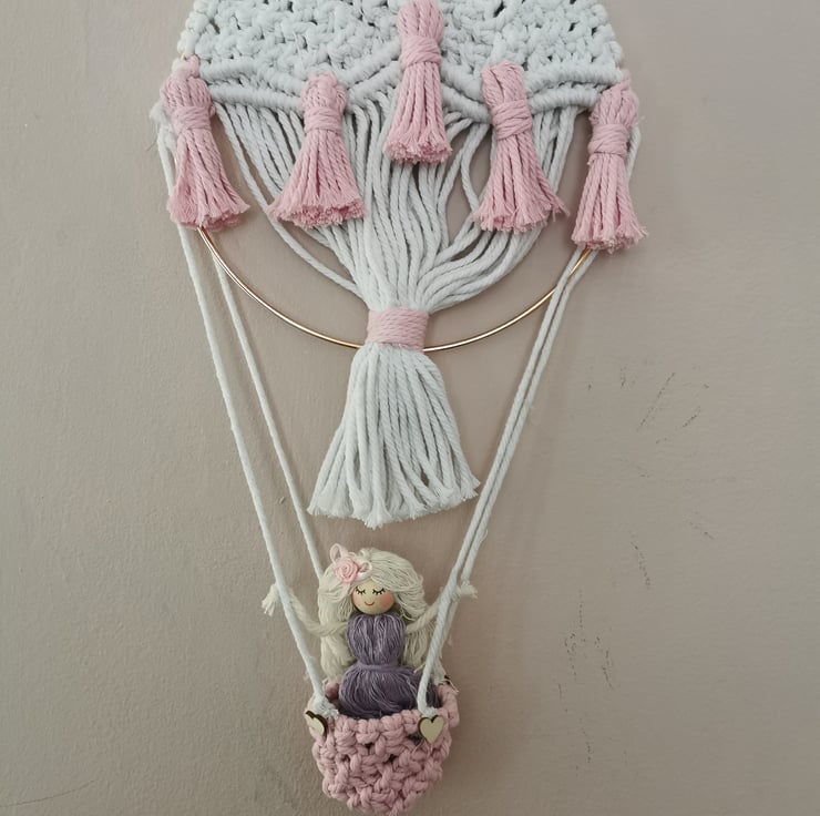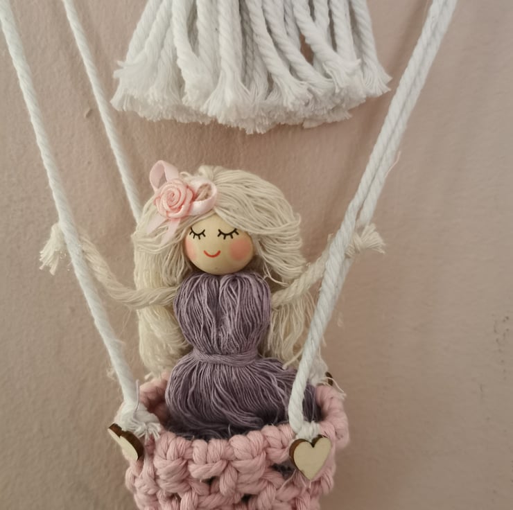 It has a macrame doll in the pink basket with a lilac dress and a pink ribbon flower in her hair