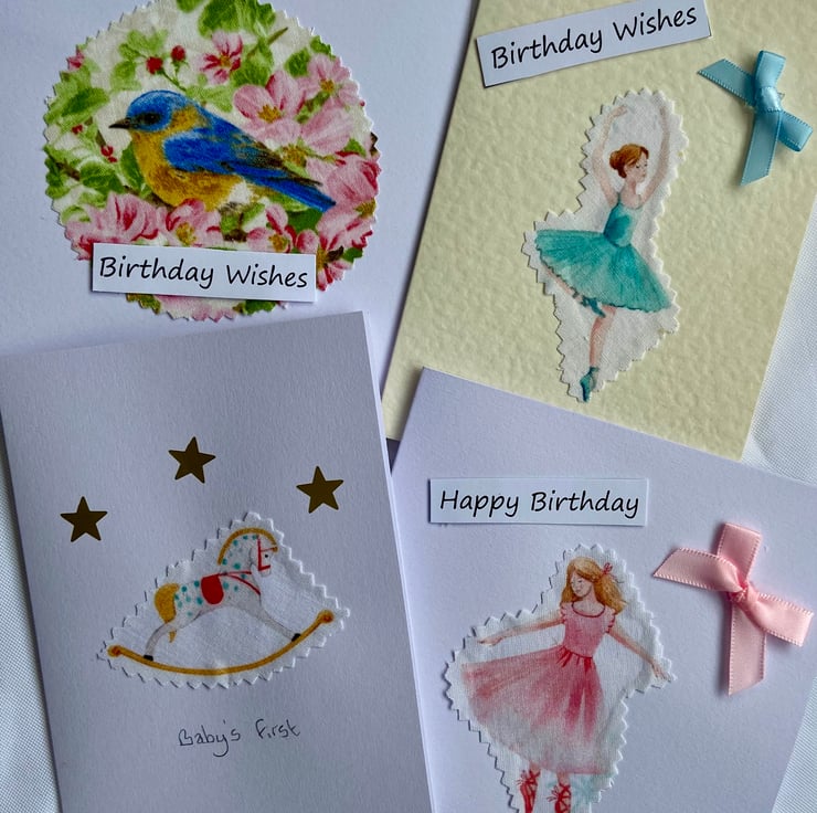 The cards are A6 in size, 100% recycled, eco friendly, acid and lignin free and the fabric used is leftover fabric scraps. They are blank inside for your own personal message, making them suitable for all occasions; and come complete with matching envelope.