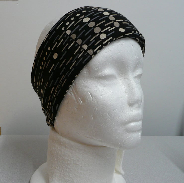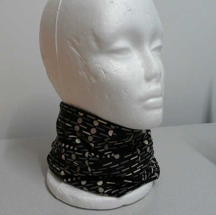 This is a really great accessory, it can be used as a snood, a neck warmer, earwarmer or headband. Made from black and gold geometric printed stretch jersey, easy to ware and easy to wash