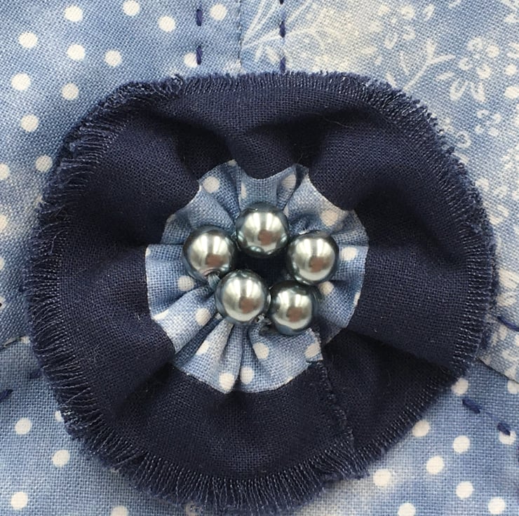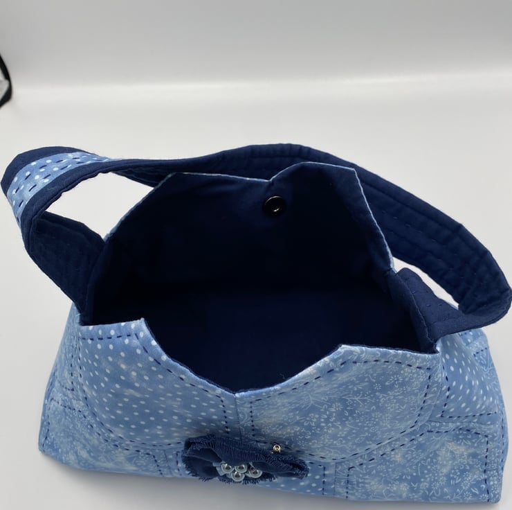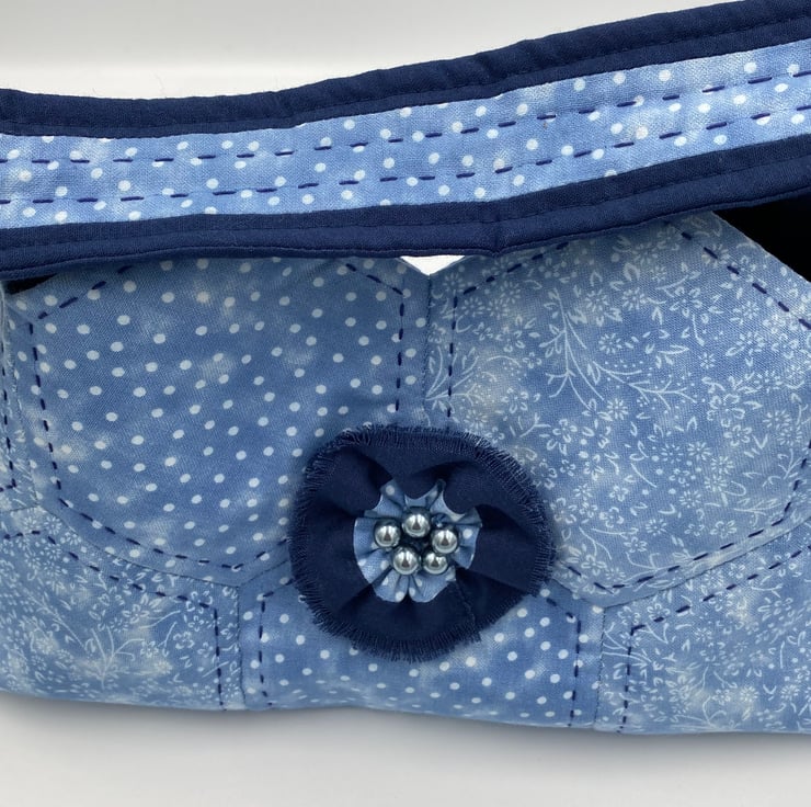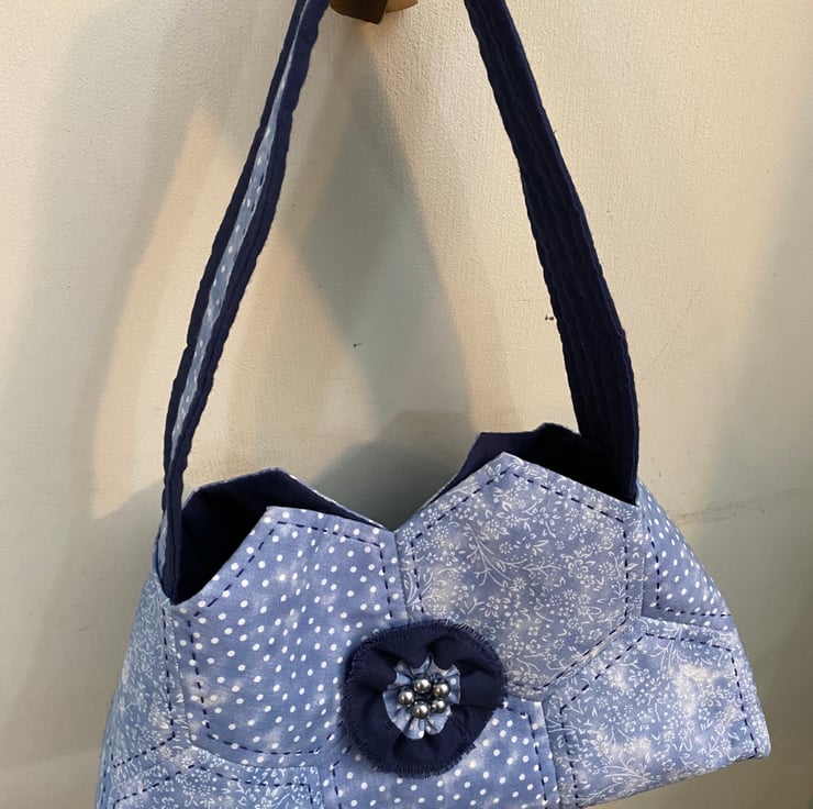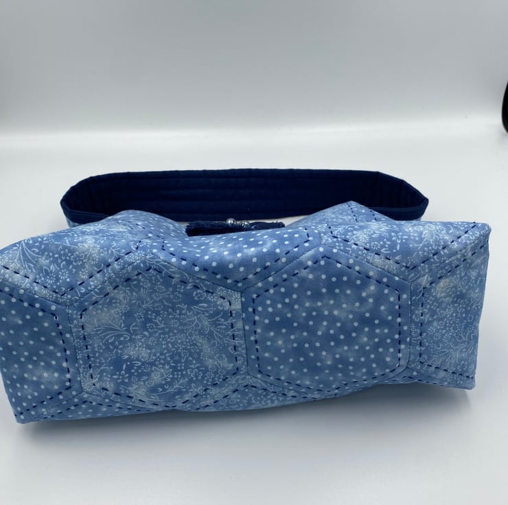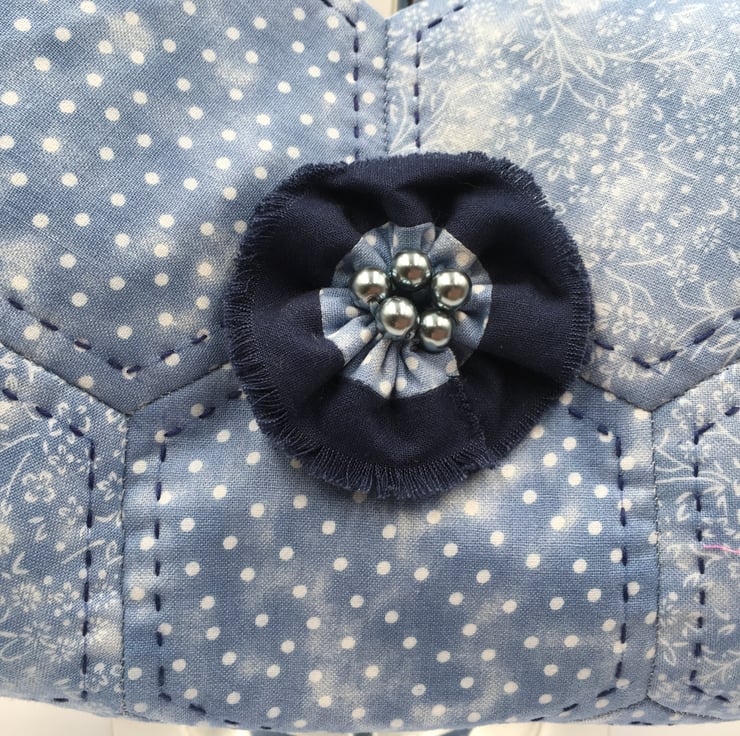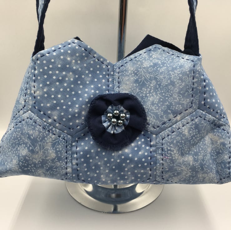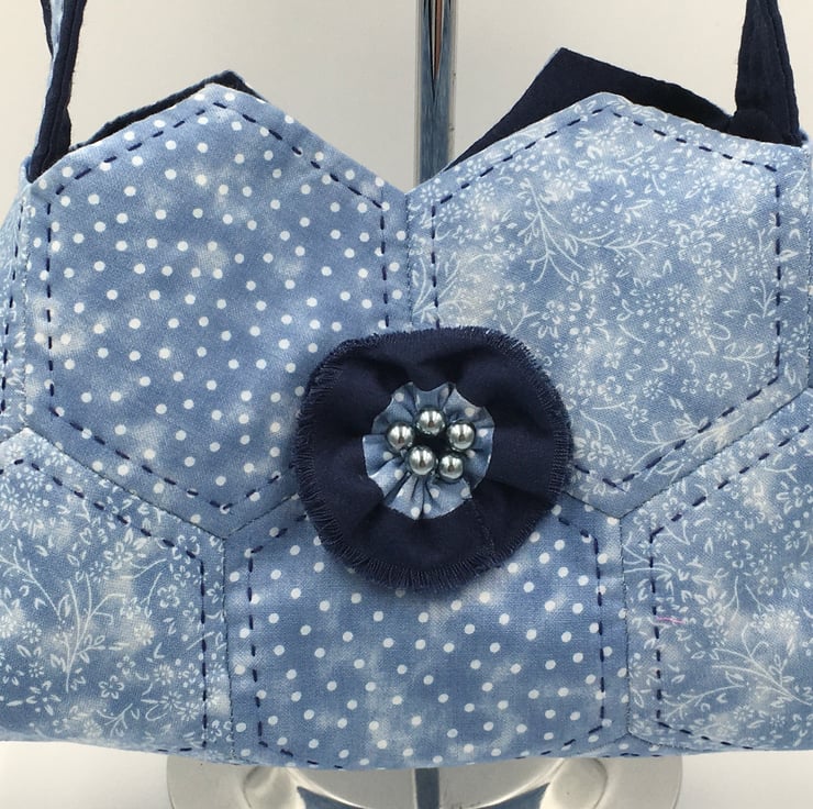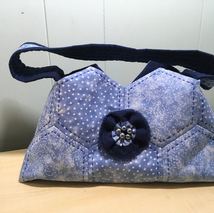 I made this using hexagons, hand stitched together in a particular shape, layered with fine wadding and hand quilted in embroidery thread. I then fully lined it in Midnight Blue quilting cotton, sewing the handle in a similar way for comfort. It fastens with a magnetic clasp and is finished off with a handcrafted decoration.