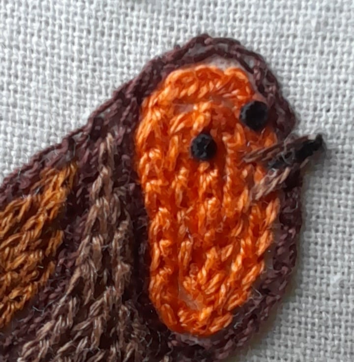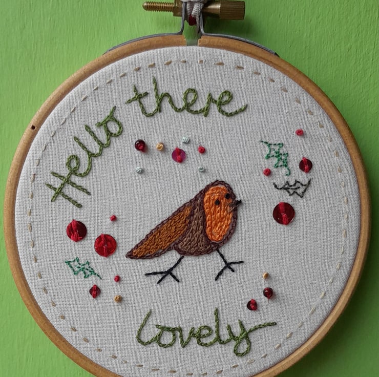 This festive piece features a sweet little stitched robin surrounded by holly leaves, tiny French knots and a smattering of red sequins. The message 'Hello there lovely' is chain stitched in green embroidery thread and for a final touch, the scene is encircled with little cream running stitches.