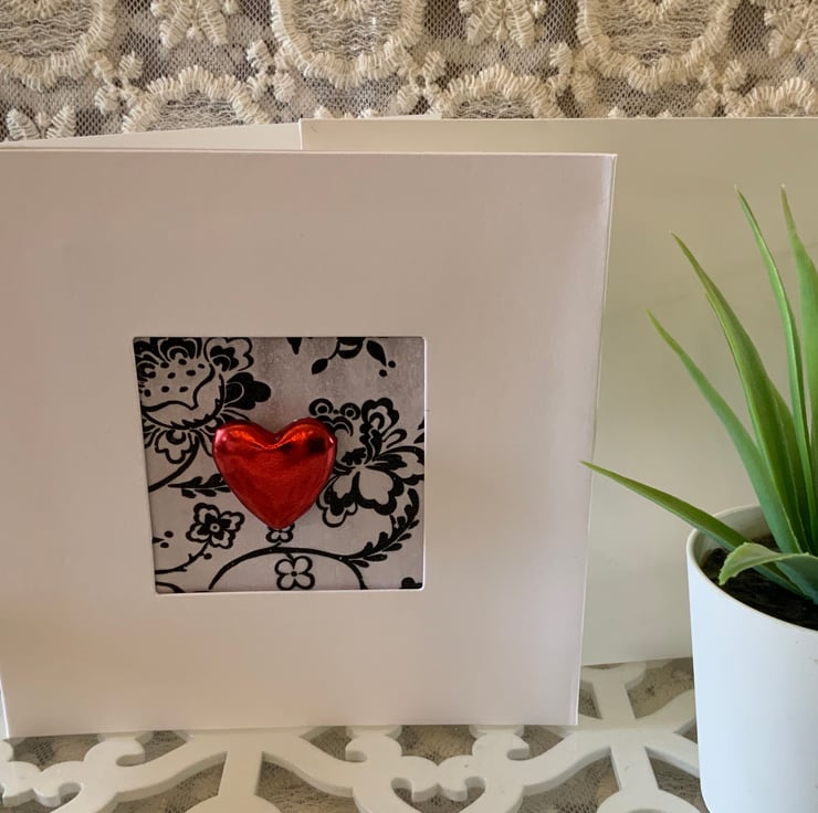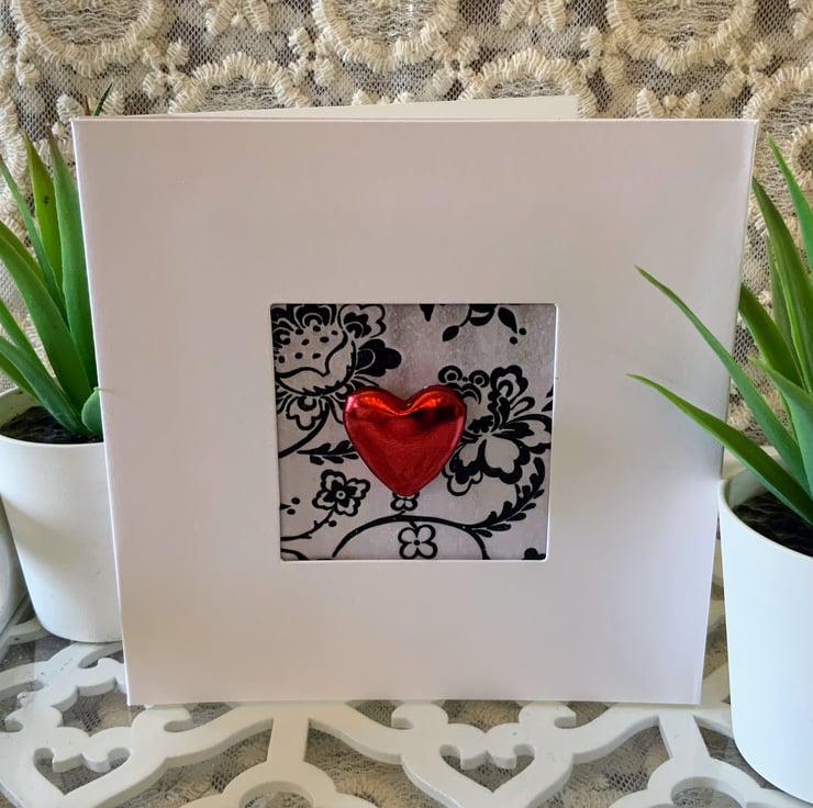A beautiful red heart embellishment is the focal point on a black and white flower background which has been decoupaged using fine rice paper with a suttle hint of sparkle.