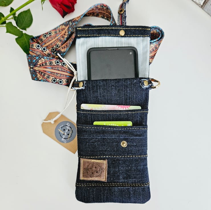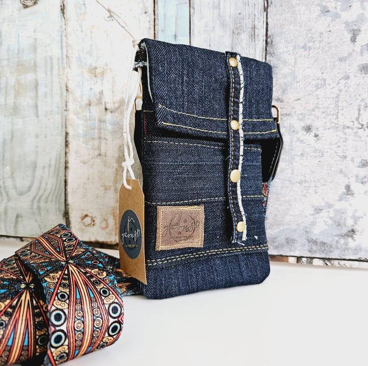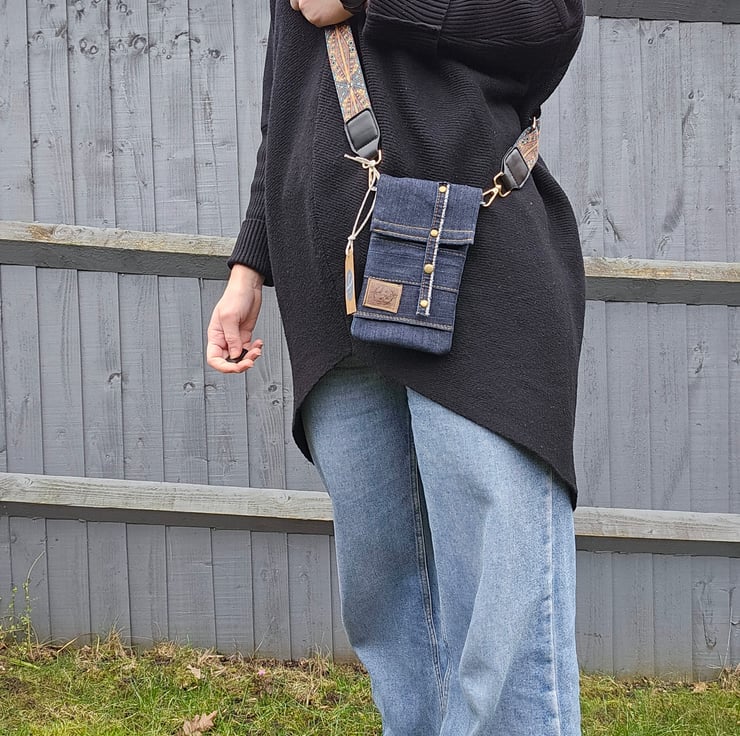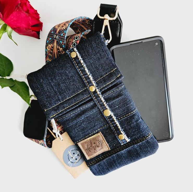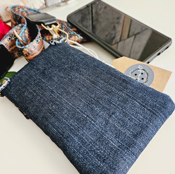 Dark denim crossbody phone bag, the perfect accessory for those on the go. This purse has an adjustable wide strap for a comfortable fit, allowing you to keep your essentials close at hand.