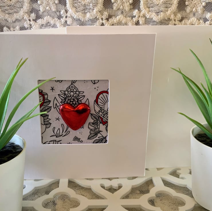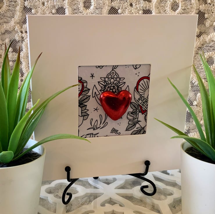 A beautiful red heart embellishment is the focal point on a black and white love tattoo background which has been decoupaged using fine rice paper with a suttle hint of sparkle. The word "Love" is also so subtle beneath the heart.