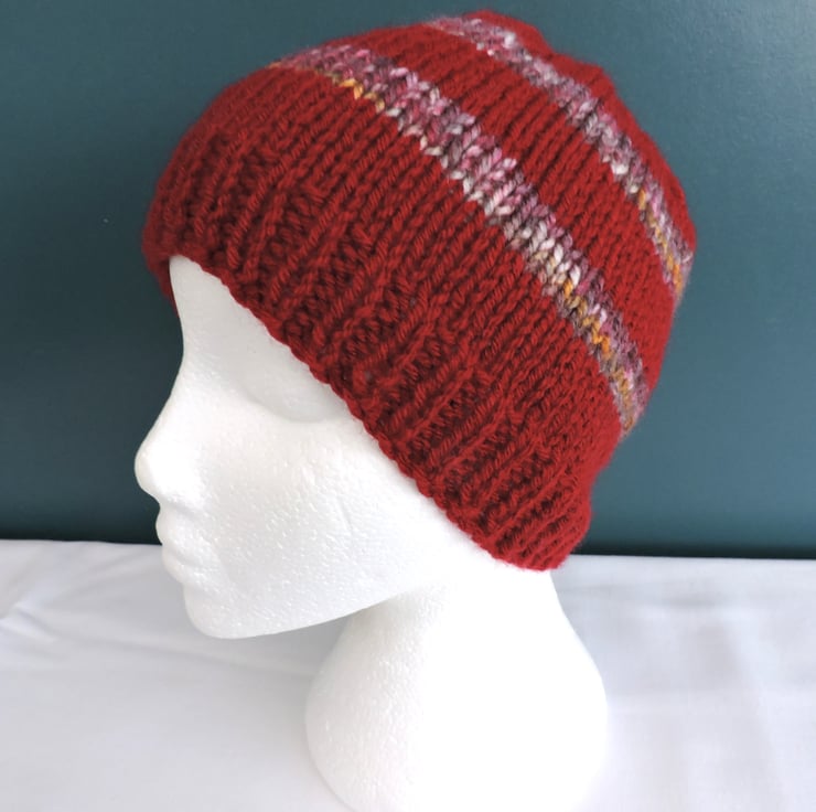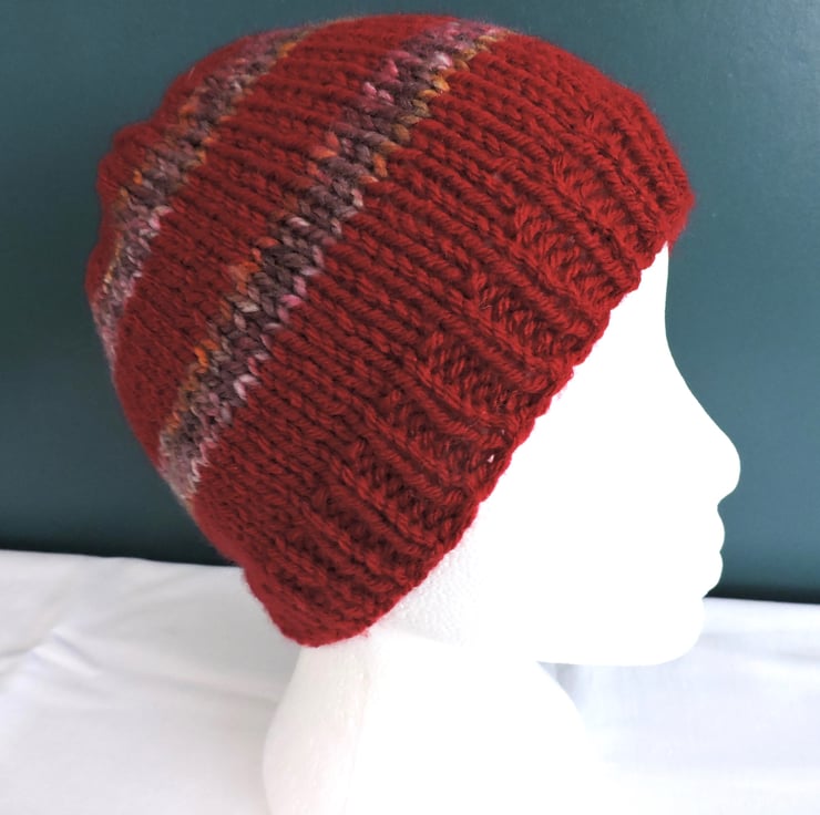 Seconds Sunday clearance item. Adults knitted beanie hat in a soft chunky wool and acrylic yarn. Red with marled bands of brown, pink, ochre and cream. Knitted with a single ribbed brim which can be left down or turned up, and stocking stitch for the body. Ideal for keeping you warm and cosy in the cold weather.