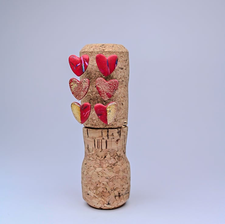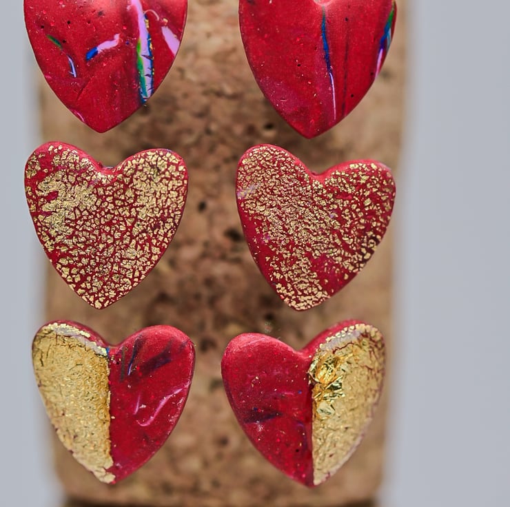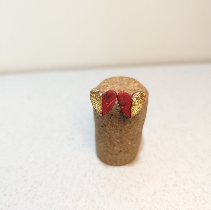 Hand made polymer clay earrings with a textured red and gold design. Stud fixing can be painted with hypo allergenic coating for free on request. Please see all photos for close up detail. All products handmade therefore there may be minor imperfections. Each pair sold as seen, message for more info