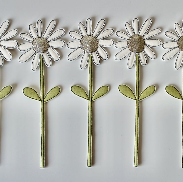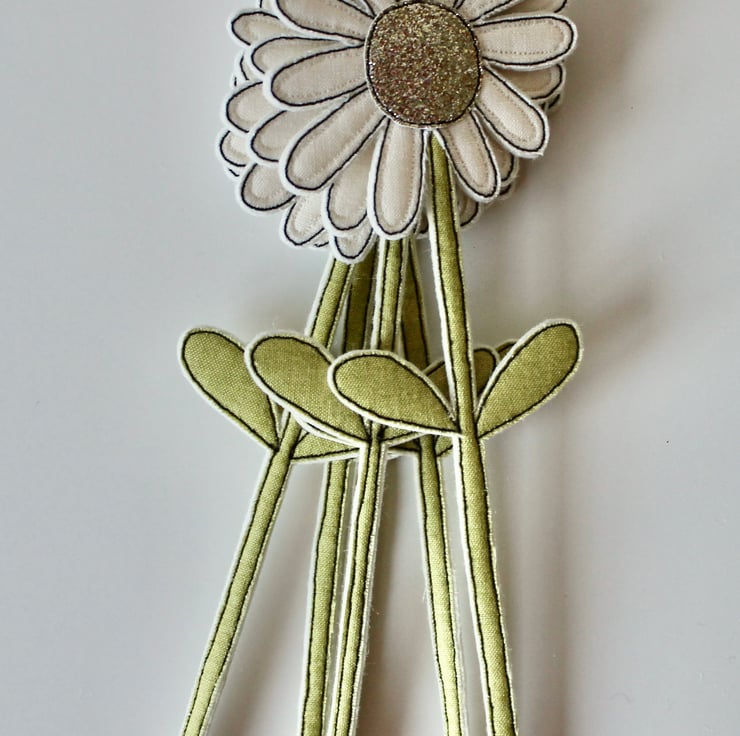 Each of the handmade flowers is sewn using glitter fabric, cotton cloth, wool felt and free hand machine embroidery; multiple layers of cloth are sewn together and cut out by hand using very sharp scissors.