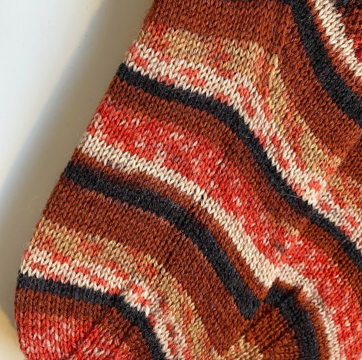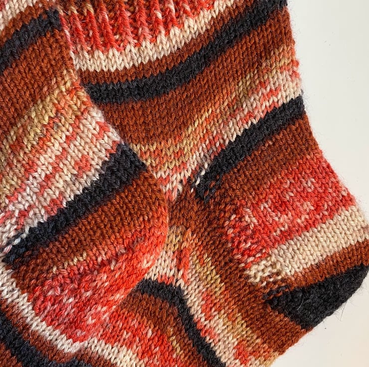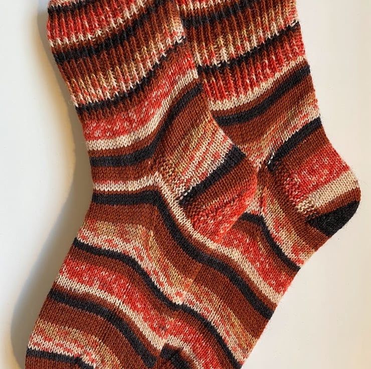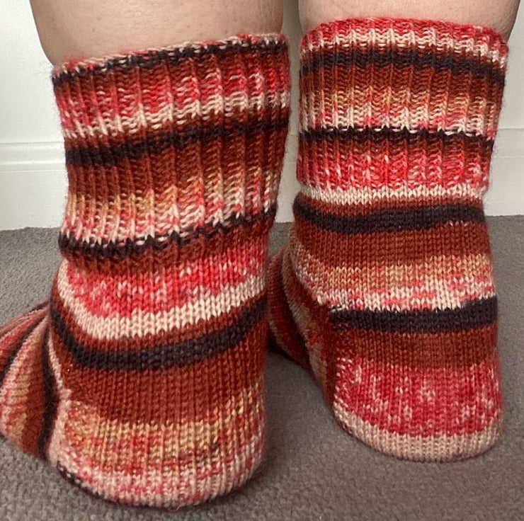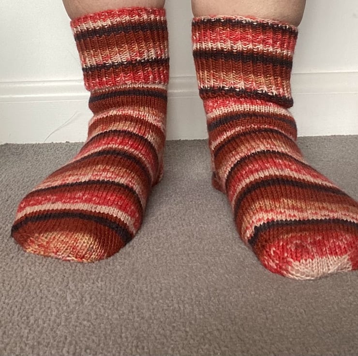 Cosy hand knitted, non-itchy socks in woollen yarn. These are my variegated socks using 75% virgin wool and 25% polyamid to fit shoe sizes 4 to 6. The yarn is dimensionally stable, hard-wearing and machine washable up to 40 degrees, with no felting and it is also dryer proof. (This yarn is space-dyed and therefore each sock will be slightly different.)) Length from heel turn to top is approximately 8" and heel to toe is also 8". Using a specific washing liquid for wool with help to prolong the life of the socks.