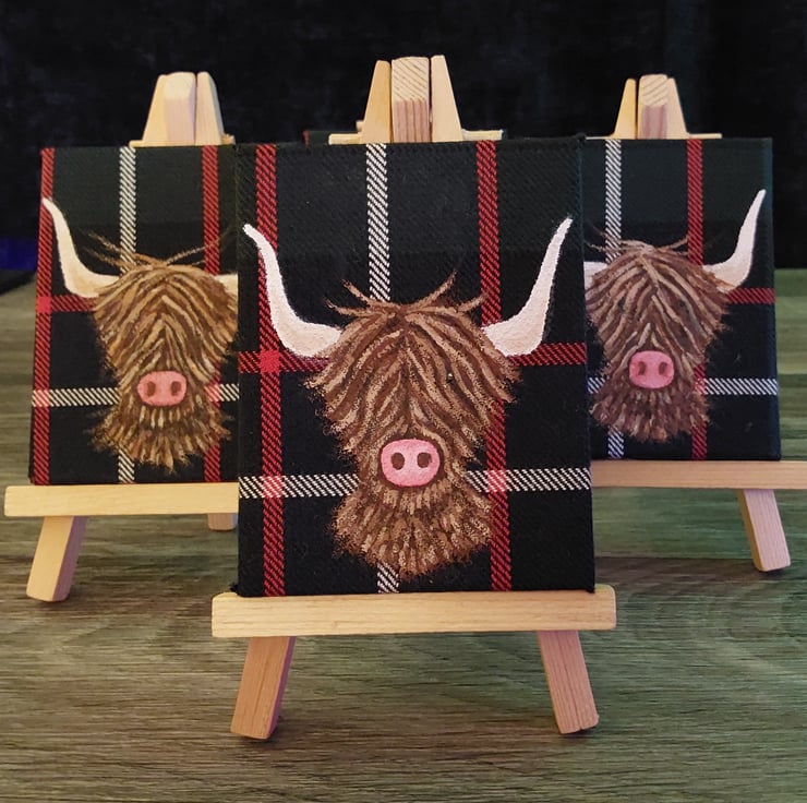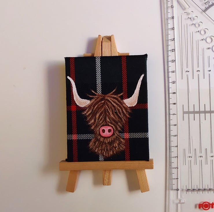 I painted this using artists quality acrylic paints on a small wood frame canvas which I covered in Hunter Modern tartan.