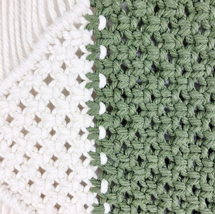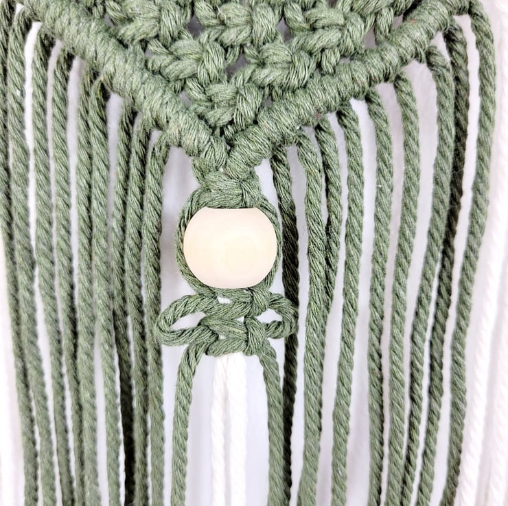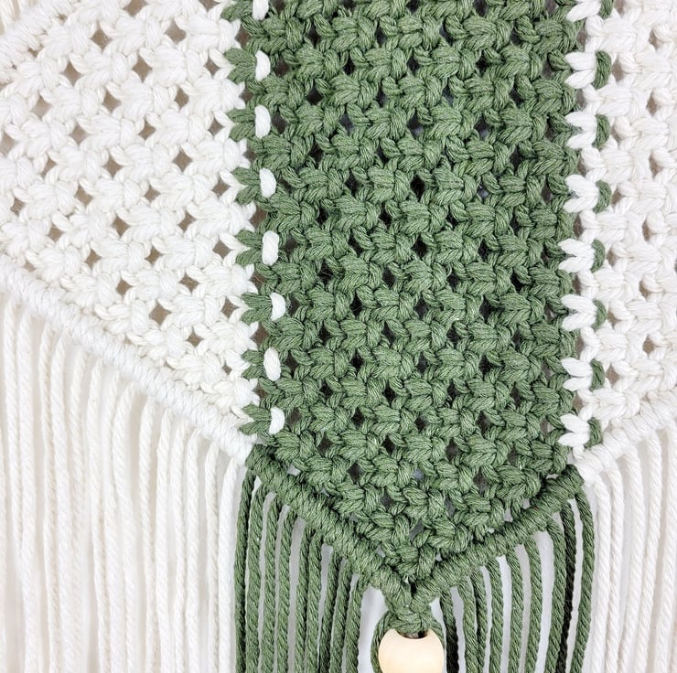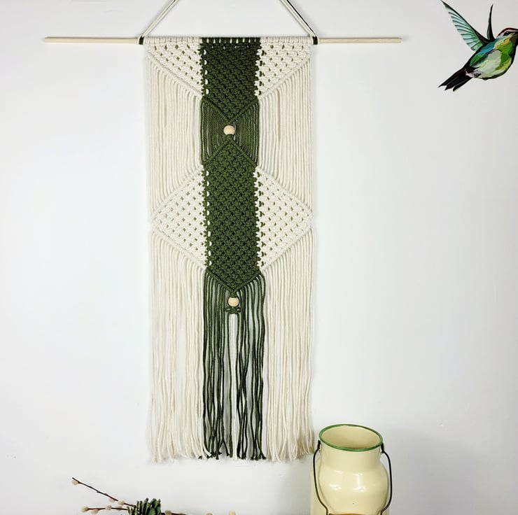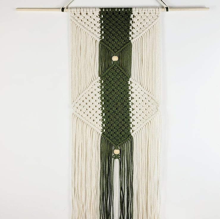Unique macrame wall hanging with a diamond pattern made with 100% cotton cord, natural beads and a wood dowel. This one is made in Natural and Olive green but you have 27 different colours to chose from! Please see the Colour chart in the pictures. The dowel is 60cm23.62in wide. The width of the wall hanging itself is 29cm11.42in and the length is 73cm28.74in. The length is measured from the top of the dowel to the end of the tassels. Length and width may vary a little due to each wall hanging being handmade. I'm happy for bespoke requests.