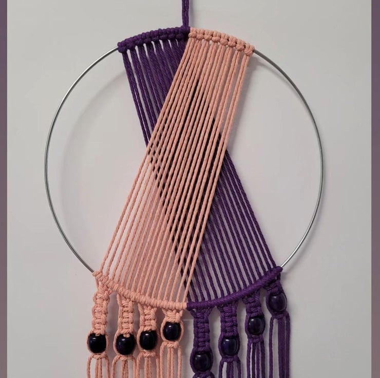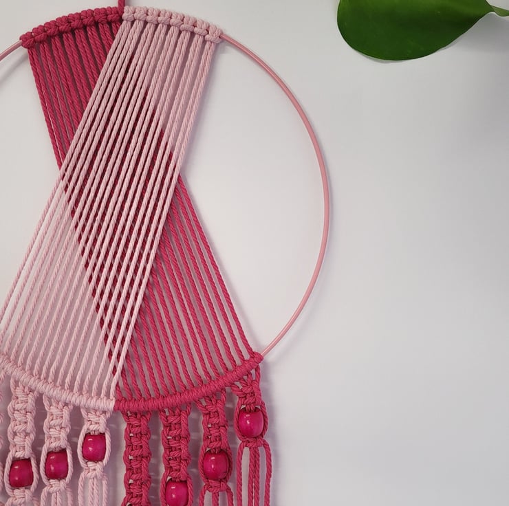 Unique two-tone macrame wall hanging made with 100% cotton cord and wooden coloured beads on a metal hoop. This one is made with Rose Red and Pink cords, Pink coloured wooden beads on a 25cm9.8 Pink metal hoop. The length of the wall hanging is approx 113cm44in and is measured from the top of the hoop to the end of the tassels. Length may vary a little due to each wall hanging being handmade. If you like it longer or shorter, please message me. 27 different coloured cords, 10 different coloured beads and 9 different coloured metal hoops to chose from! Please see the Colour chart in the pictures.