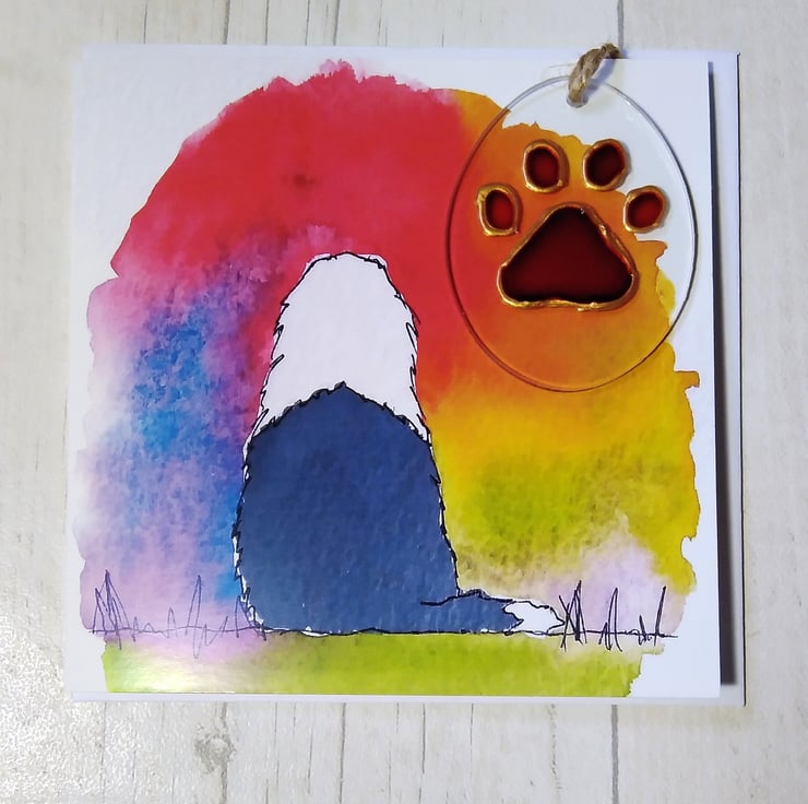 'Old English Sheepdog memories' is a lovely card for anyone who has lost their beloved dog. Printed on 300gsm card, the card is 5 inches square and is left blank inside for your own message. Comes supplied with an envelope and in a cello sleeve.The paw print sun catcher is hand painted using glass paints that create a stained glass effect. It measures 60mm x46mm x2mm. Finished with twine for hanging. A card and a gift in one. Pet sympathy gift, pet loss gift, pet bereavement gift.