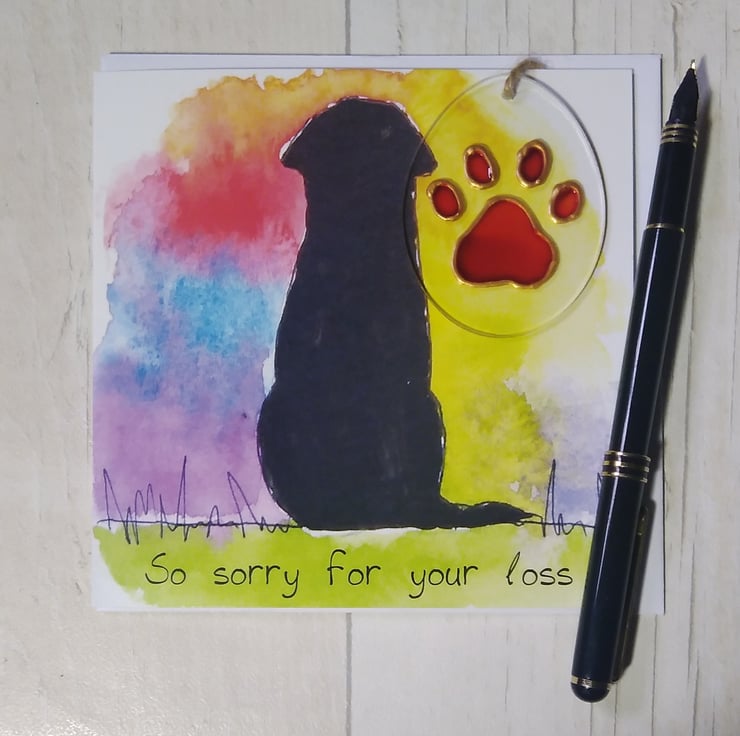 'Labrador' is a lovely card for anyone who has lost their beloved dog 'So sorry for you loss' is printed on the front. Printed on 300gsm card, the card is 5 inches square and is left blank inside for your own message. Comes supplied with an envelope and in a cello sleeve.The paw print sun catcher is hand painted using glass paints that create a stained glass effect. It measures 60mm x46mm x2mm. Finished with twine for hanging. A card and a gift in one. Pet sympathy gift, pet loss gift, pet bereavement gift.