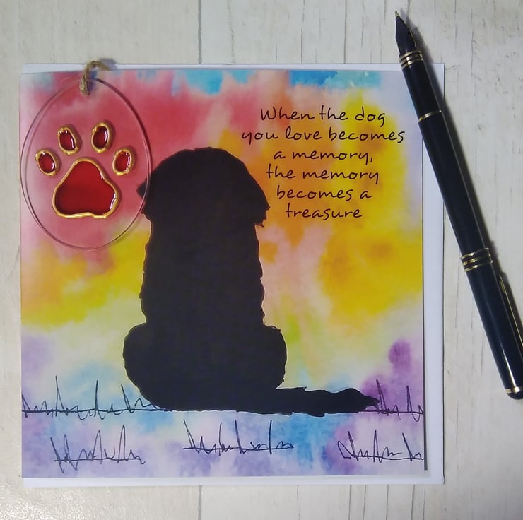 'Newfoundland memories rainbow' is a lovely colourful card for anyone who has lost their beloved dog 'When the dog you love becomes a memory, the memory becomes a treasure' is printed on the front. Printed on 300gsm card, the card is 15 centimetres square and is left blank inside for your own message. Comes supplied with an envelope and in a cello sleeve.The paw print sun catcher is hand painted using glass paints that create a stained glass effect. It measures 60mm x46mm x2mm. Finished with twine for hanging. A card and a gift in one. Pet sympathy gift, pet loss gift, pet bereavement gift.
