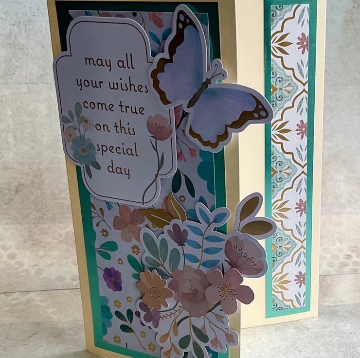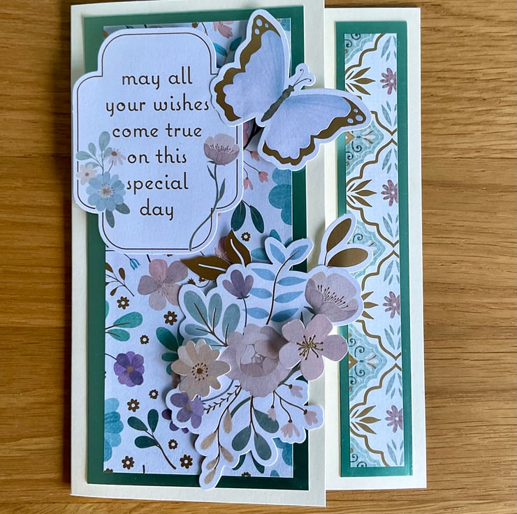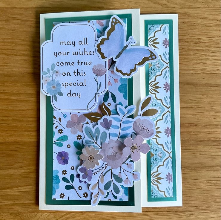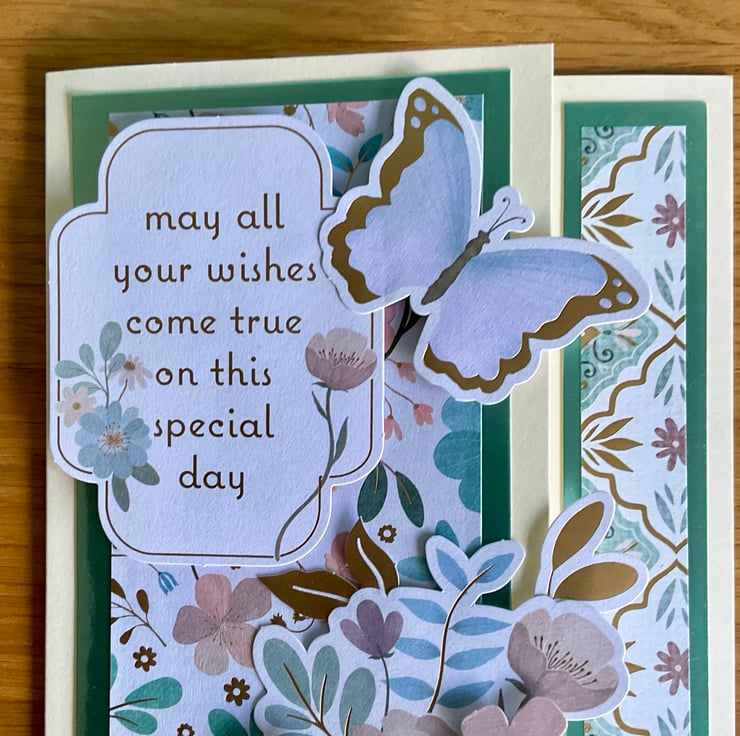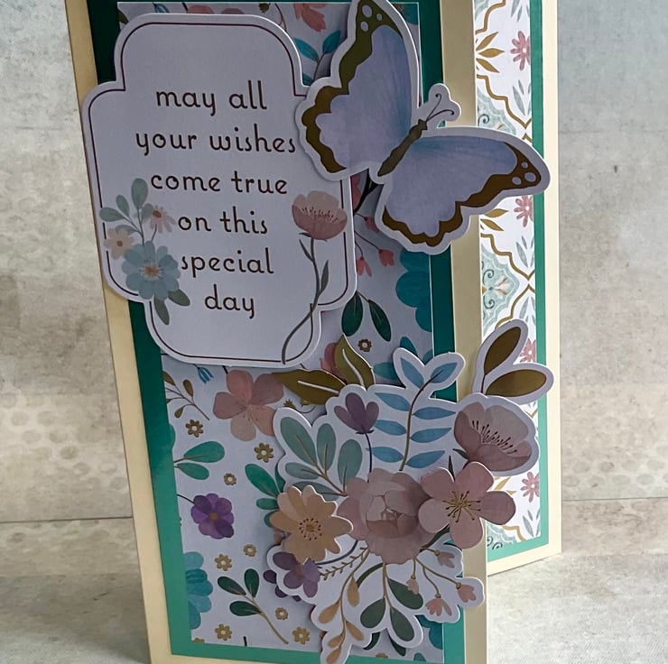 The words ‘May all your wishes come true on this special day’ have been applied in 3D adding depth and interest.