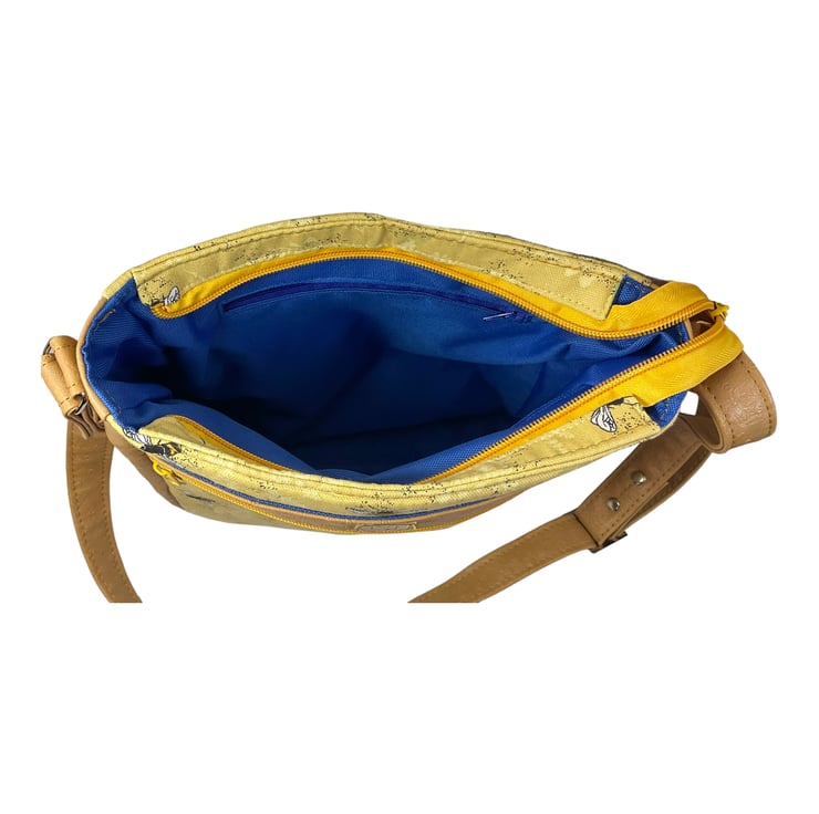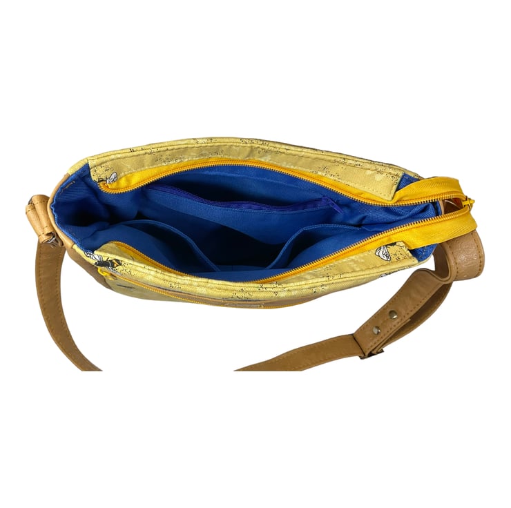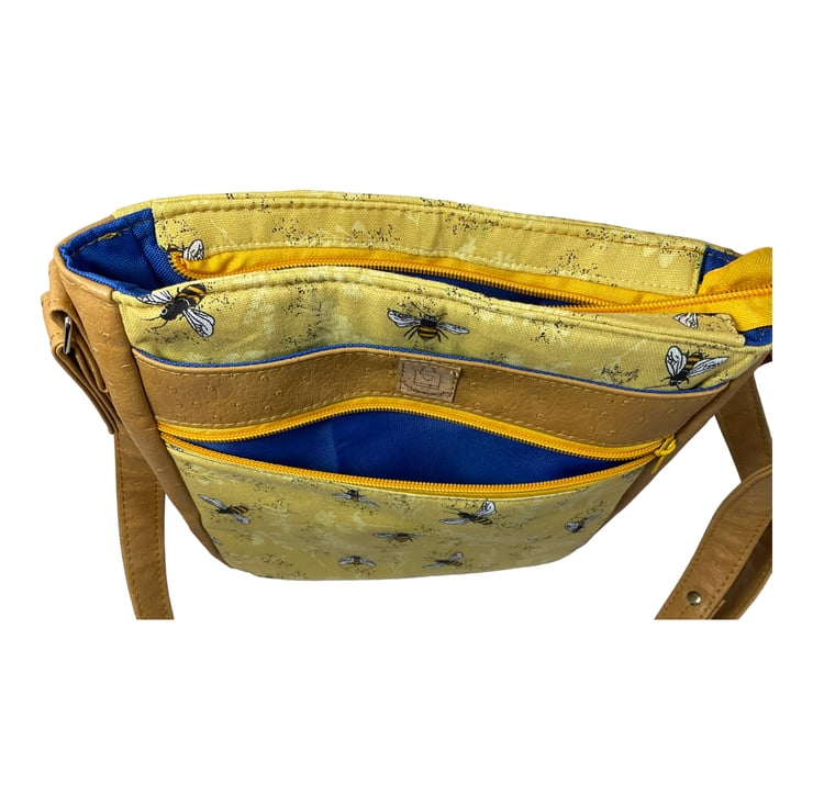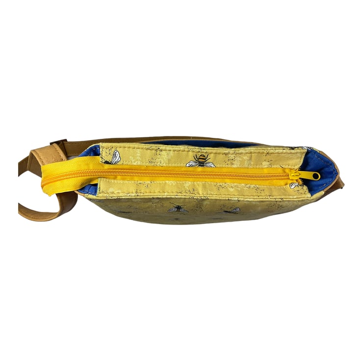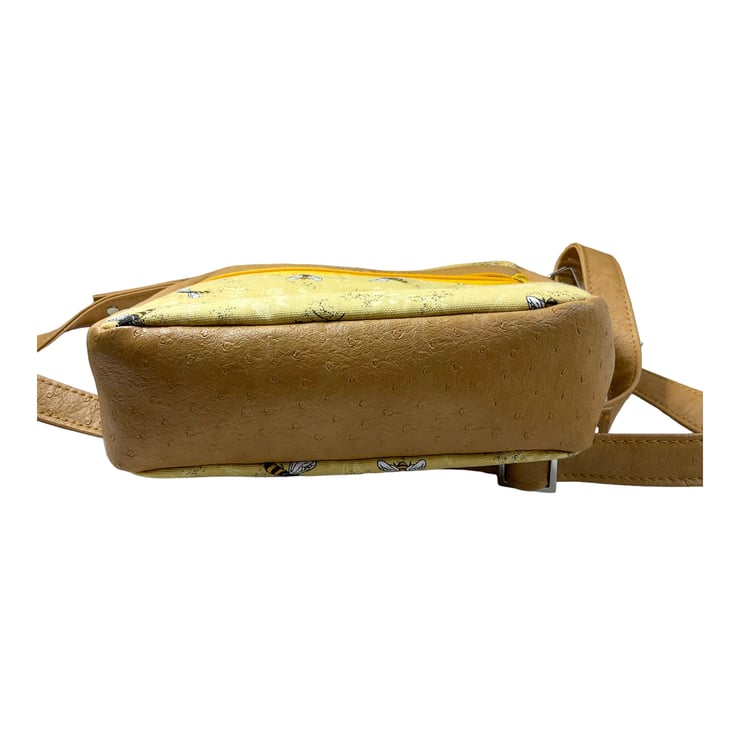 A medium sized messenger style handbag, with a gusset that extends all around the bag. Made in cute bee print cotton fabric, on a golden yellow background for the front and back, whilst the gusset, a feature panel on the front and the generous crossbody strap are all made in golden caramel ostrich skin effect faux leather vinyl.