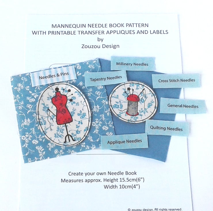 This needle book sewing pattern is straight forward to make and includes printable transfer needle labels and a mannequin applique which buyers can print out on to transfer paper then iron on to light coloured fabric and use to decorate their needle book.