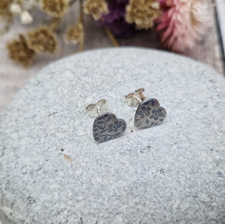 These handmade heart stud earrings, crafted from recycled silver, feature a delicate floral pattern etched onto their surface and finished with an oxidised treatment to enhance the intricate details. The contrast between the darkened design and the soft matte silver beautifully showcases the charm of the floral motif and the timeless heart shape. With their understated elegance, these earrings are perfect for everyday wear or adding a touch of nature-inspired beauty to any outfit.