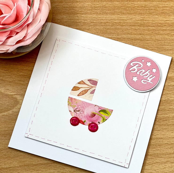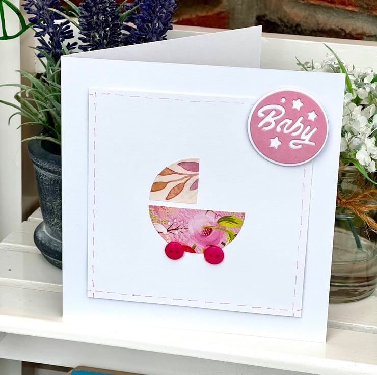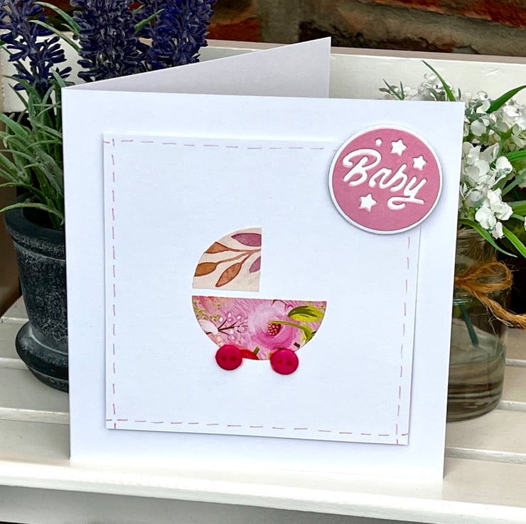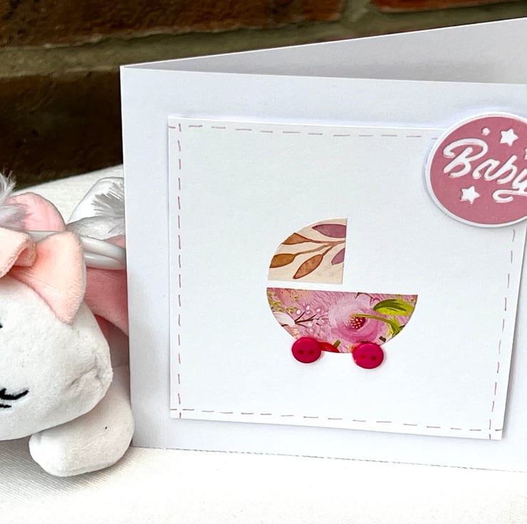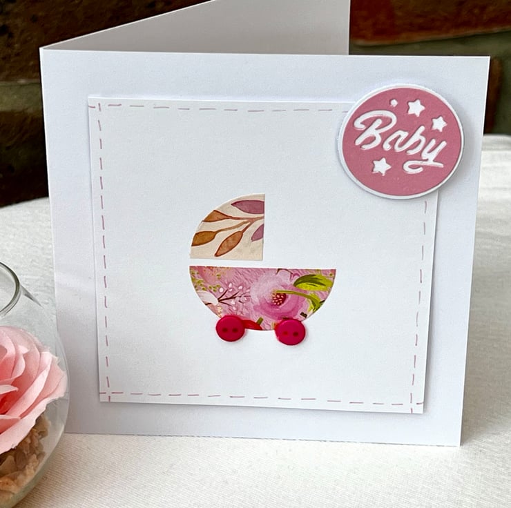 The front cover design is a colourful pram design, finished with buttons for the wheels. The card measures approximately 5x5 inches and includes a white envelope. The inside of the card has been left blank for your message.