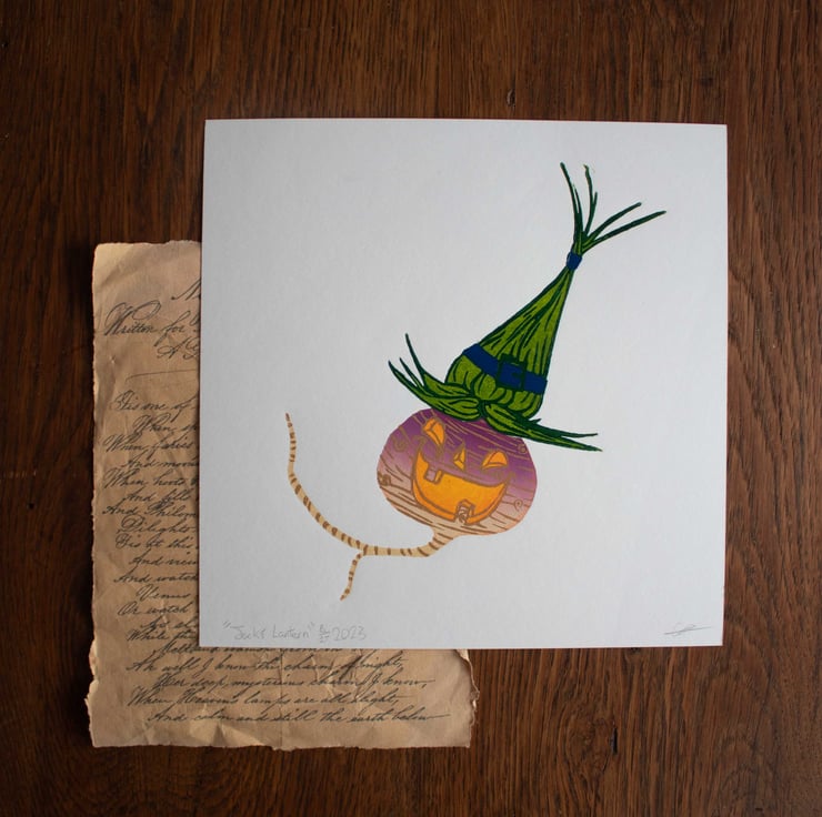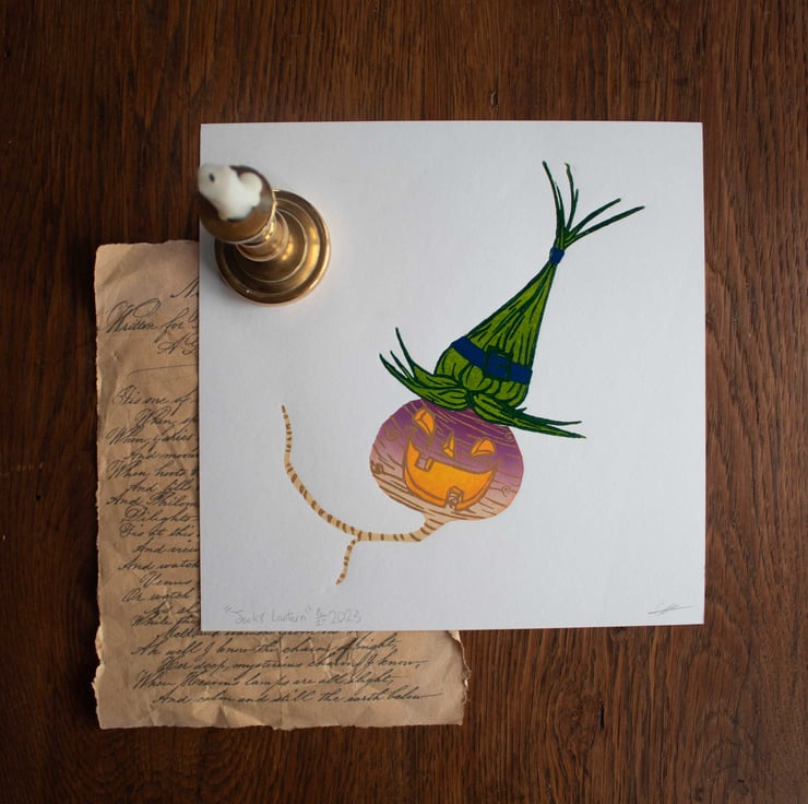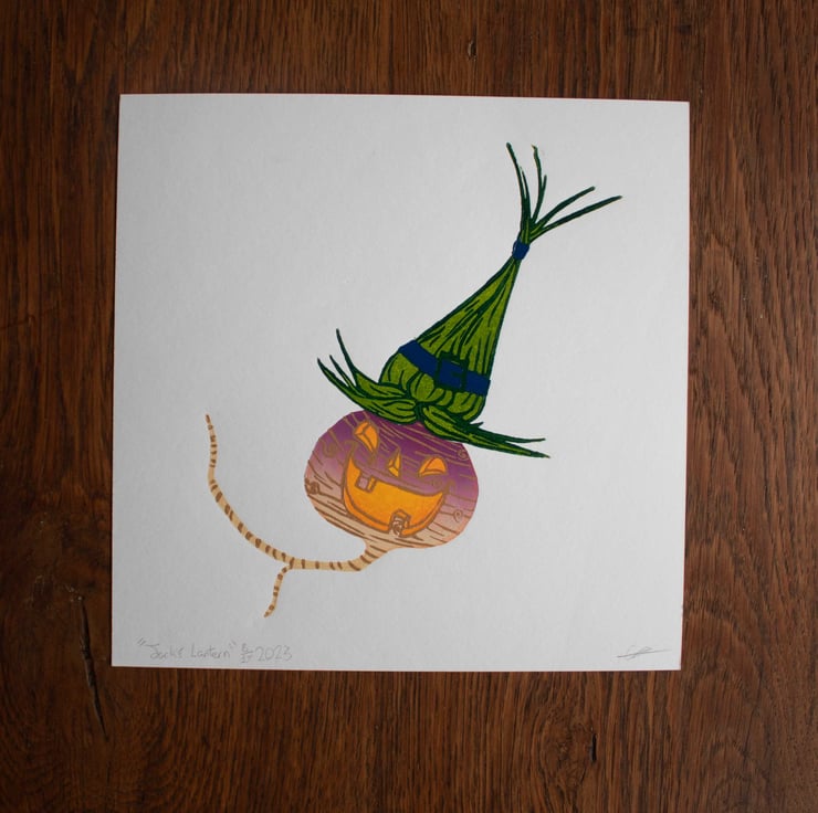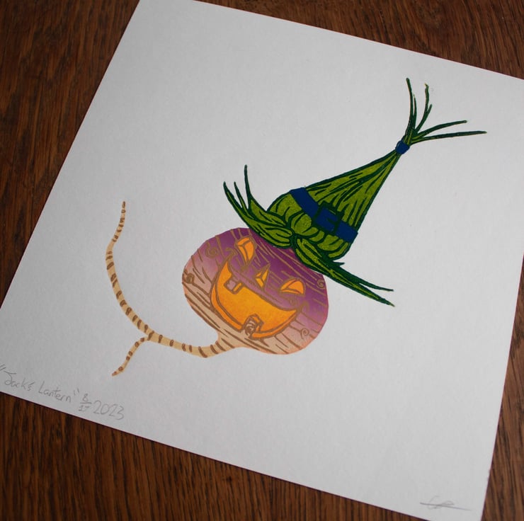 This Lino print is inspired by the Humble jack-o-lanterns; originating from Celtic traditions in Irland, Scotland and Wales and being primarily carved from turnips, swedes or other large root vegetables then placed into windows or near doorways to frighten away Stingy Jack and other wandering evil spirits.