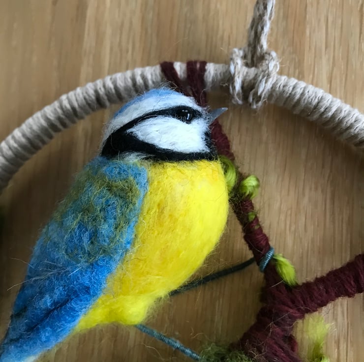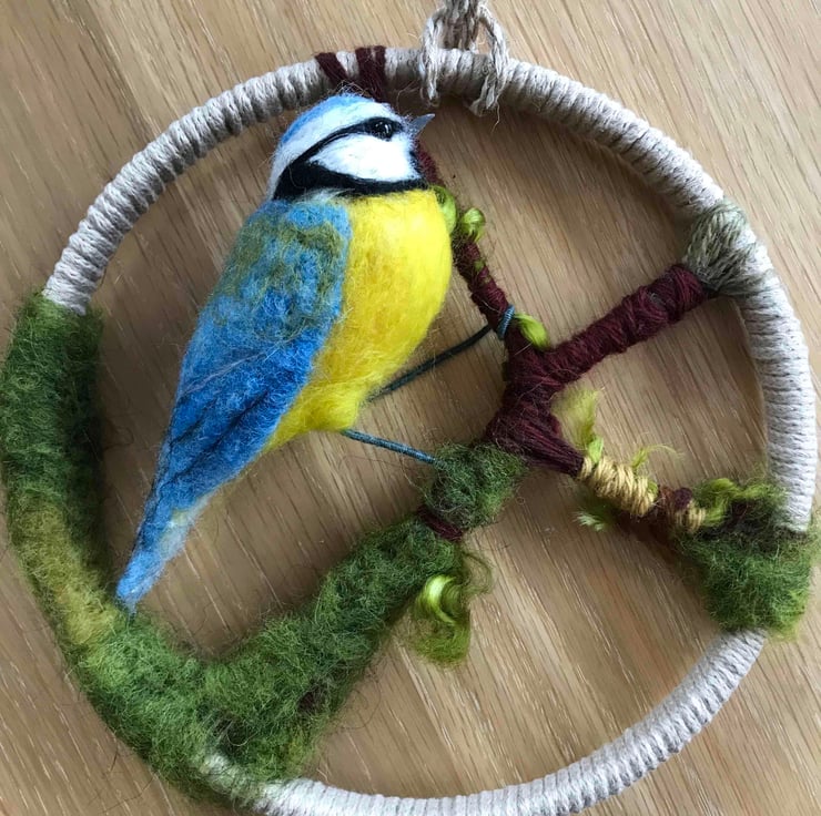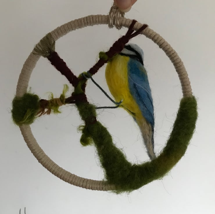 The needle felted blue tit has wire legs and these are attached to the branch.
