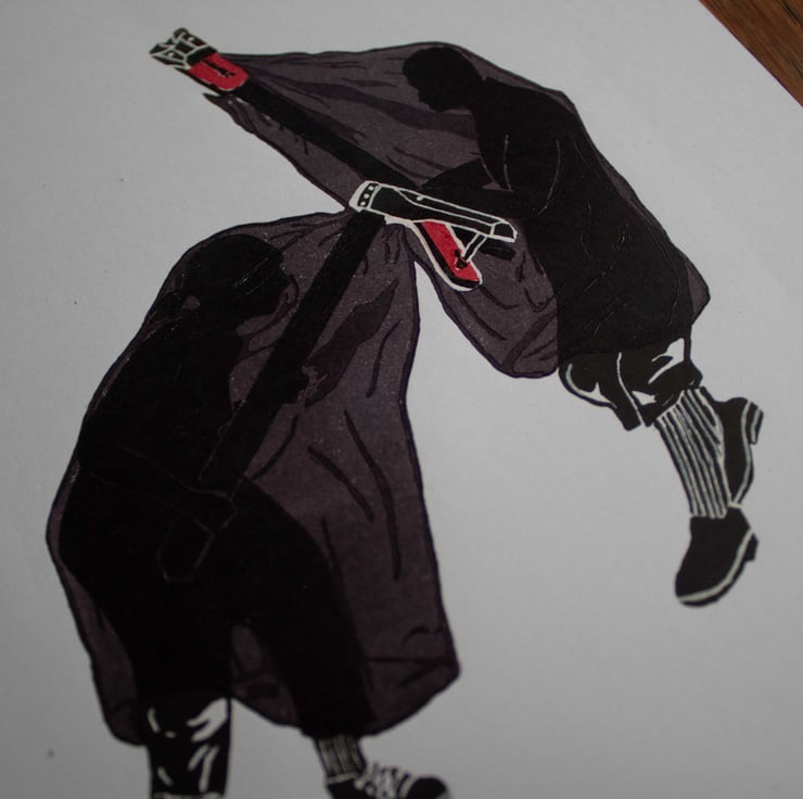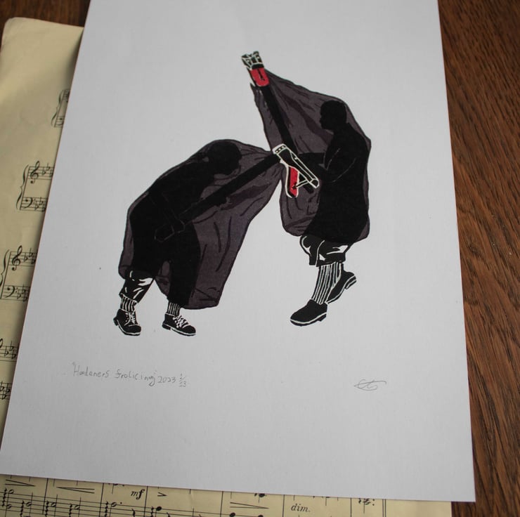 During spring 2023 I watched a group of hooderns perform and while they meandered through the crowd I would occasionally get a glimpse of the performer's silhouette. I was inspired to create a print that mimicked the fabric that shrouded the performer under the cloak of the hoodern horse.