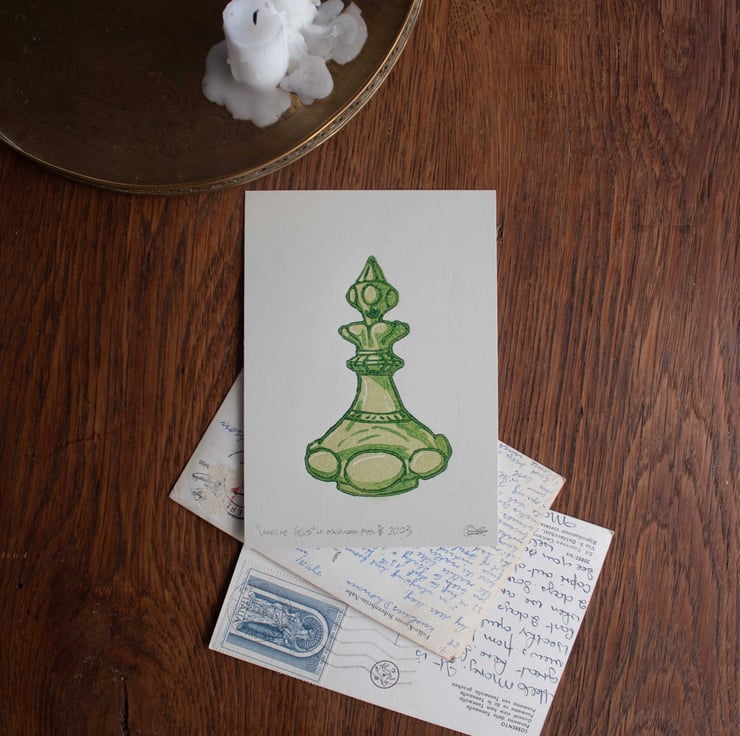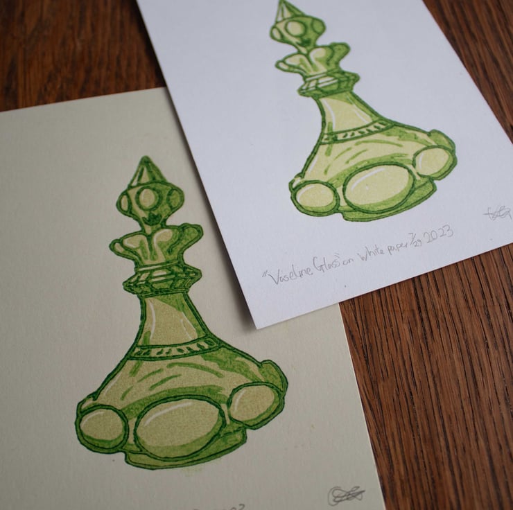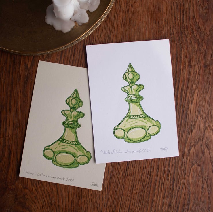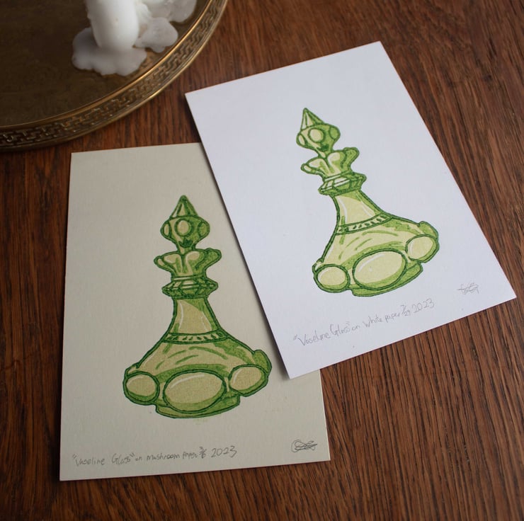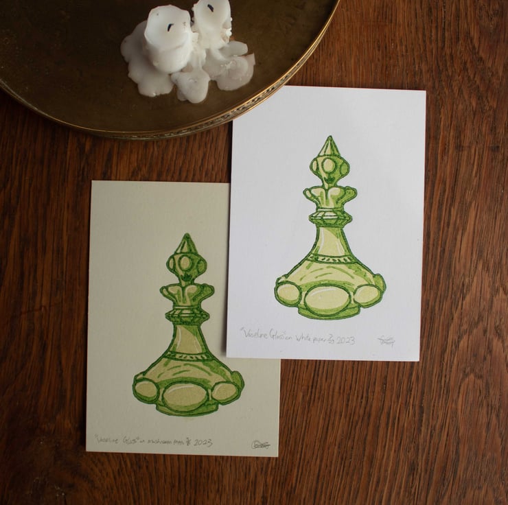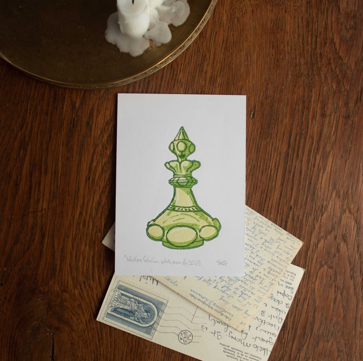 This original artwork “Vaseline Glass” is a 4-layer reduction linocut of a uranium glass decanter that even glows in the dark like the item that inspired it, This artwork is printed on A6 recycled 300 GSM Card