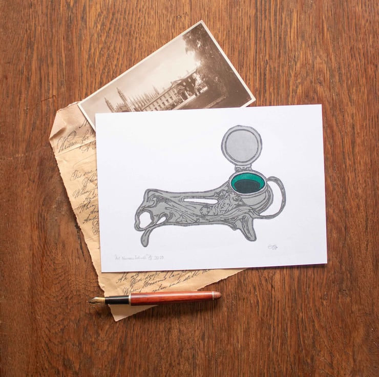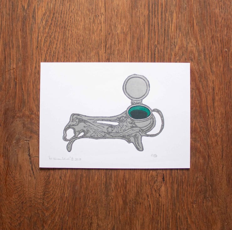This original artwork “Art Nouveau Inkwell” is a 2-layer reduction linocut of an antique inkwell; The silver ink used for the main body of the print is hand-made using pigment from expired makeup pallets and is Printed on an A5 white recycled 300 GSM-card